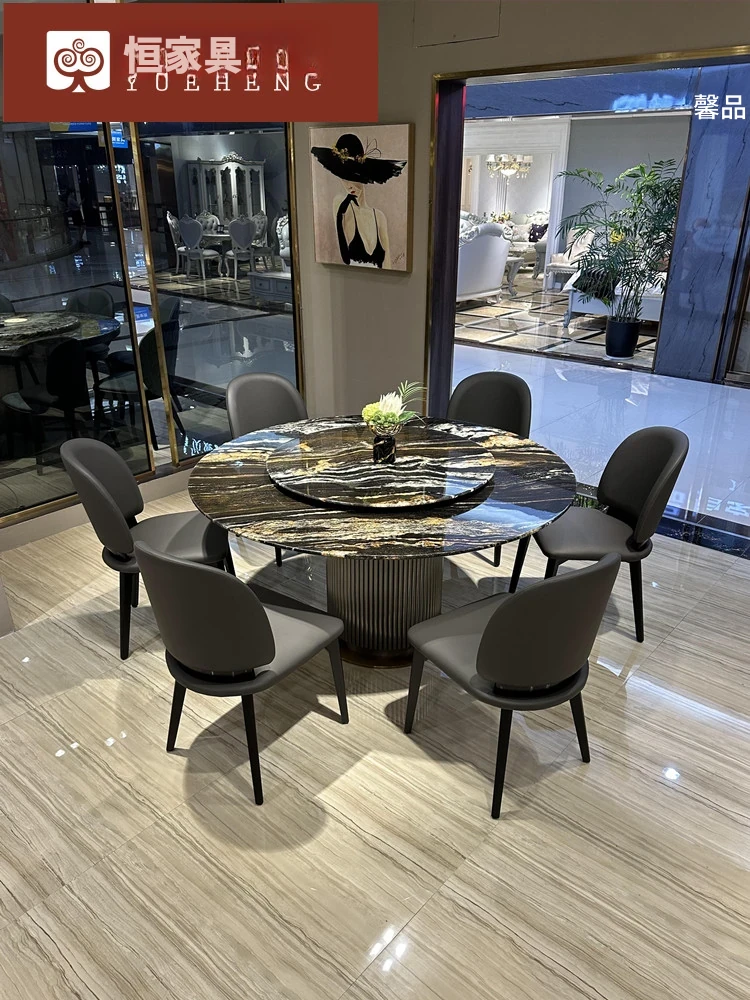 阅恒大のモダンでシンプルな黒白色の大理石円形ダイニングテーブル&チェアセット!軽やかなラグジュアリー感を演出し、回転式デザインで使い勝手抜群。別荘にぴったりなスタイリッシュな一品です!