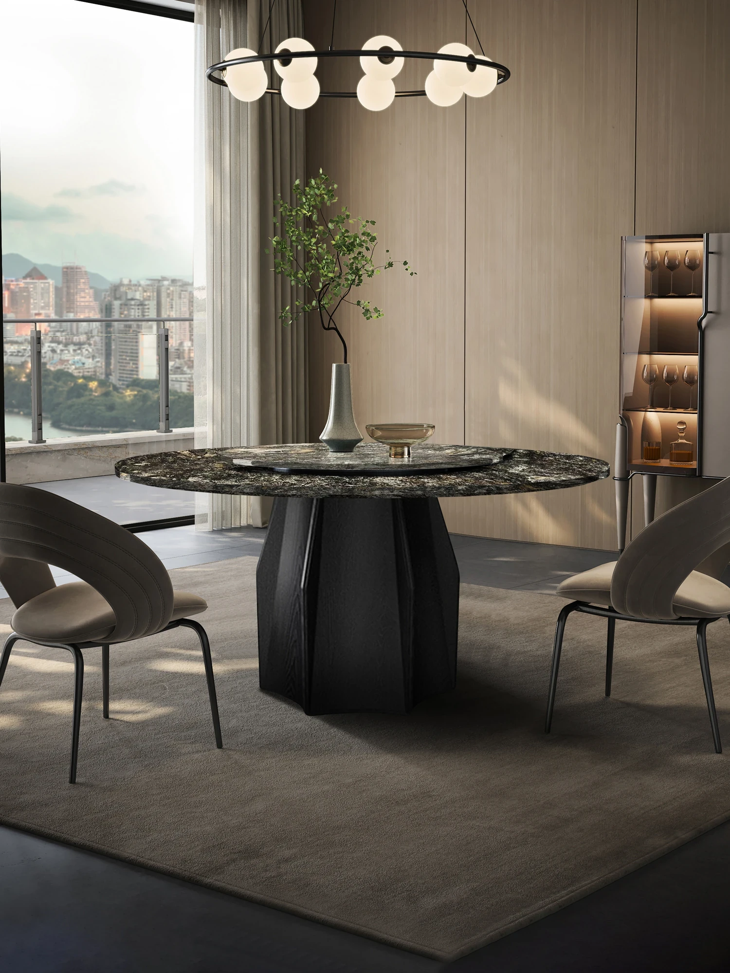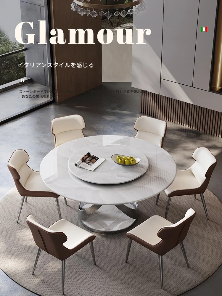 現代的で洗練された軽奢の岩板ダイニングテーブル&チェアセット - 超クリスタルストーン製のラウンドテーブル。イタリアンスタイルの高級感あふれるホテルや宿泊施設に最適!