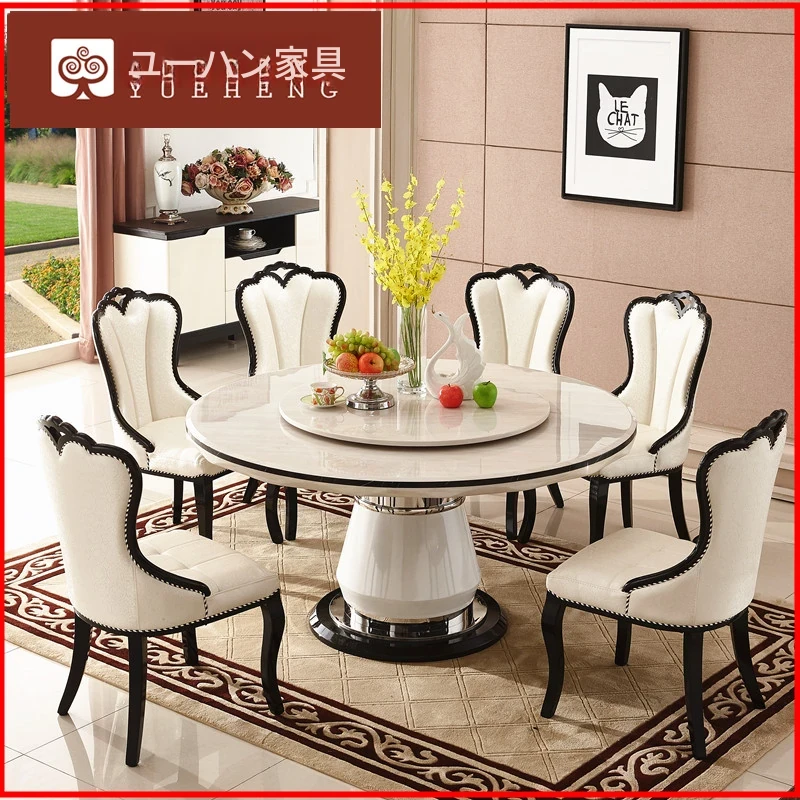 阅恒大のシンプルな大理石ダイニングテーブルとチェアセット、モデルルームや自宅に最適!豪華な丸型デザインで、別荘や高級住宅にぴったり。快適な食事空間を演出します!