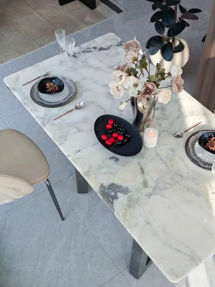 WARMブルージェイド豪華石製ダイニングテーブル - ヴィラにぴったりの輸入ライトラグジュアリー天然大理石製、仏山製の高級長方形テーブルで、上質な食事空間を演出します。