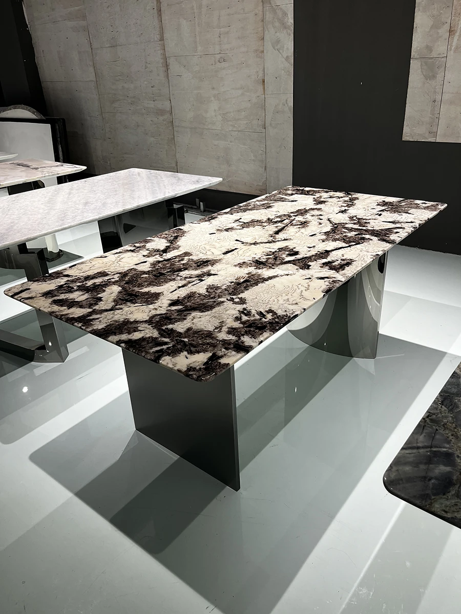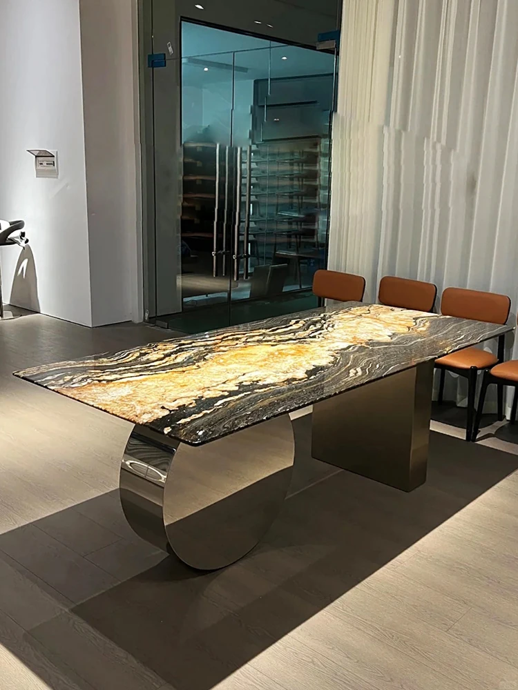 高級感溢れる天然大理石長方形ダイニングテーブル - 小さなヴィラや家にぴったりのラグジュアリーな一品!エレガントなデザインで、食卓を特別な空間に演出します。