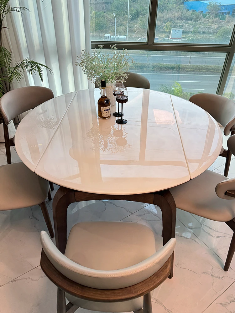 伸縮自在!天然大理石の多機能ダイニングテーブル - 壁にぴったり、コンパクトな新中式スタイルの丸テーブルと椅子セットで、小さな家でも広々とした食卓を実現!