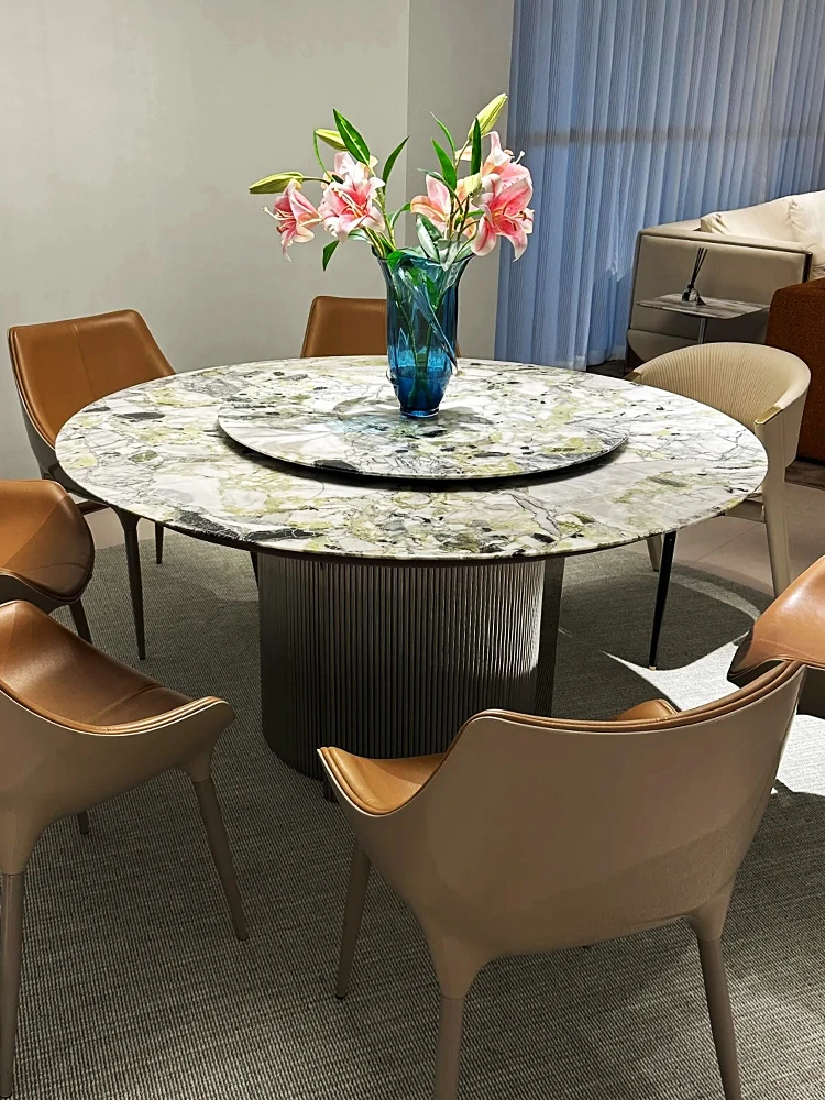 Imported Cold Jade Luxury Stone Dining Table - Elegant Italian High-End Round Marble Table for Villas with Rotating Tray - Perfect for Upscale Dining Experiences