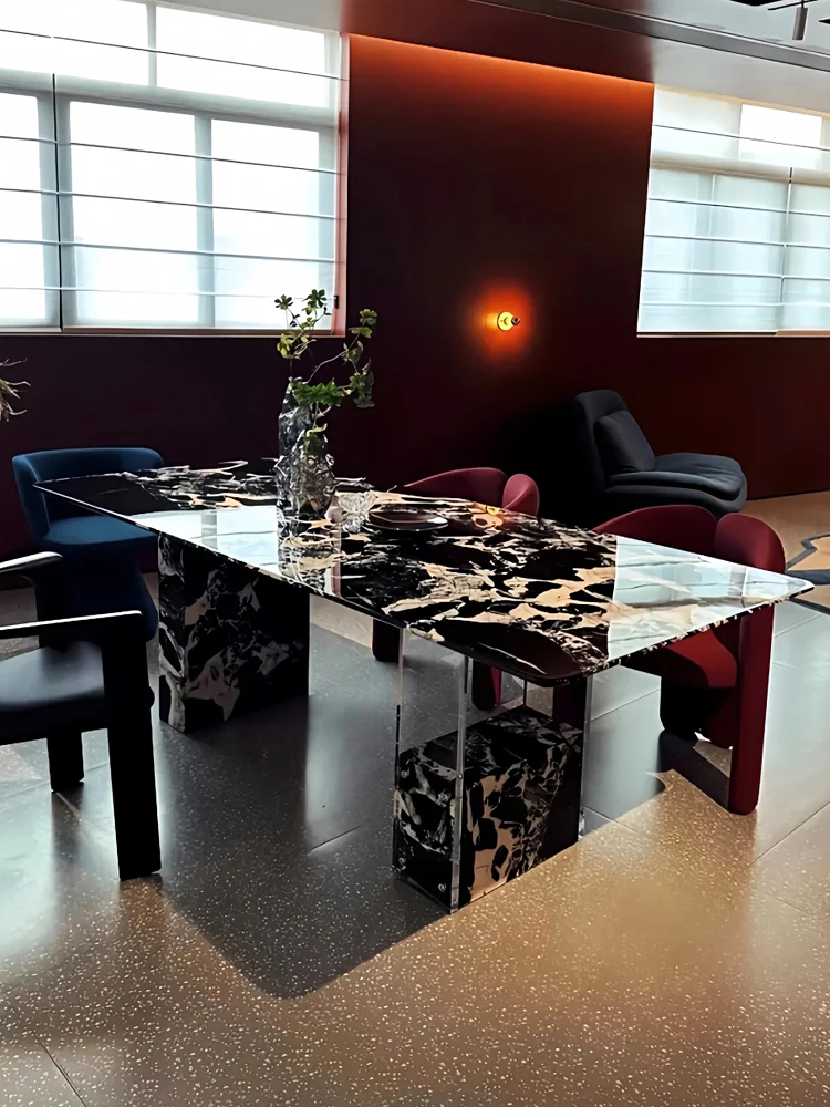 Elegant High-End Marble Dining Table with Transparent Acrylic - Luxurious Square Table Featuring Natural Gemstone Design and Premium Quality Dining Chairs