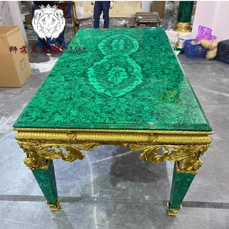 Luxury Classical European-Style 24K Gold-Plated Peacock Stone and Pure Copper Carved Frame Long Dining Table - Regal Elegance for Your Dining Experience