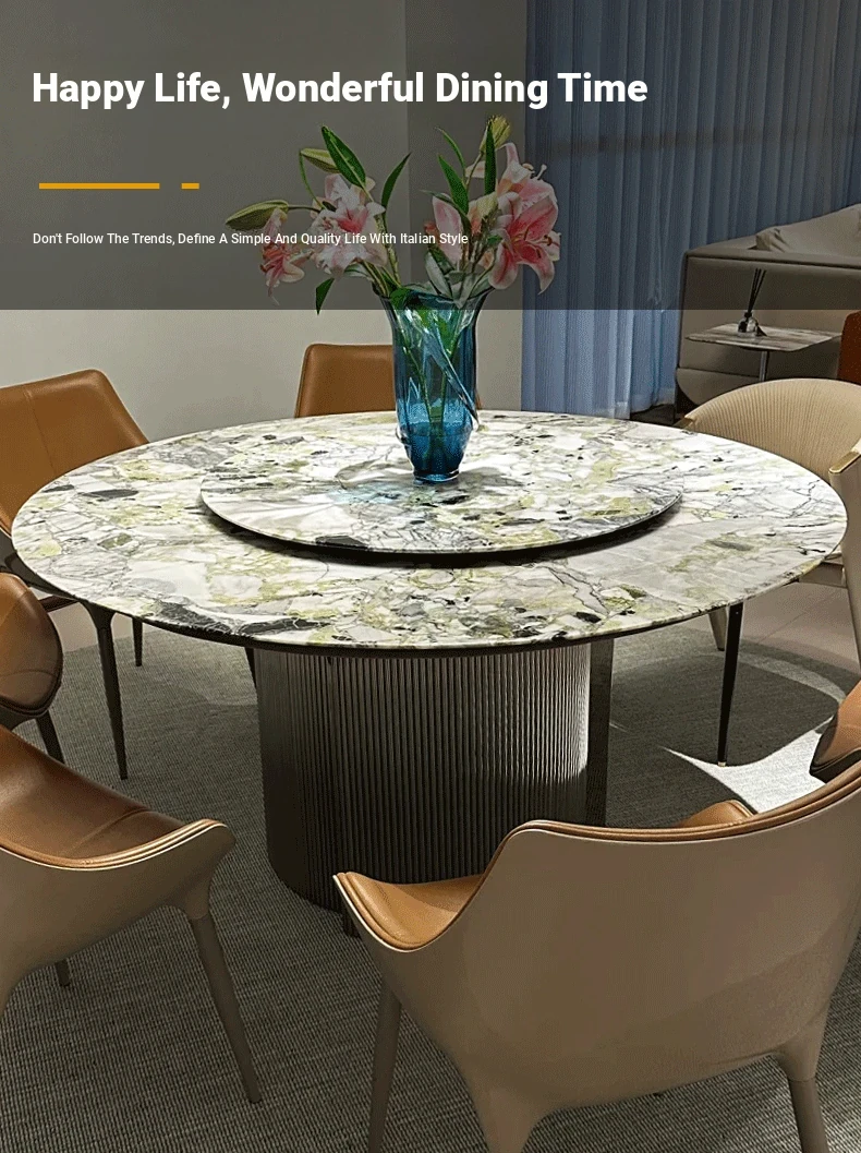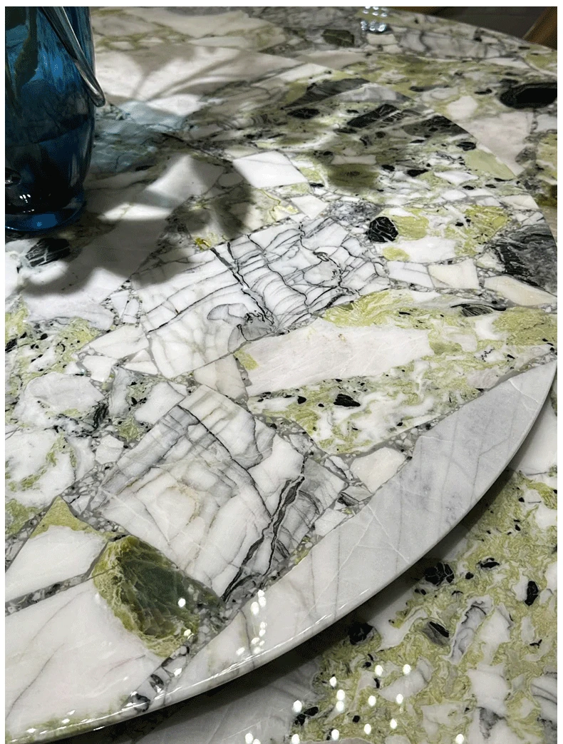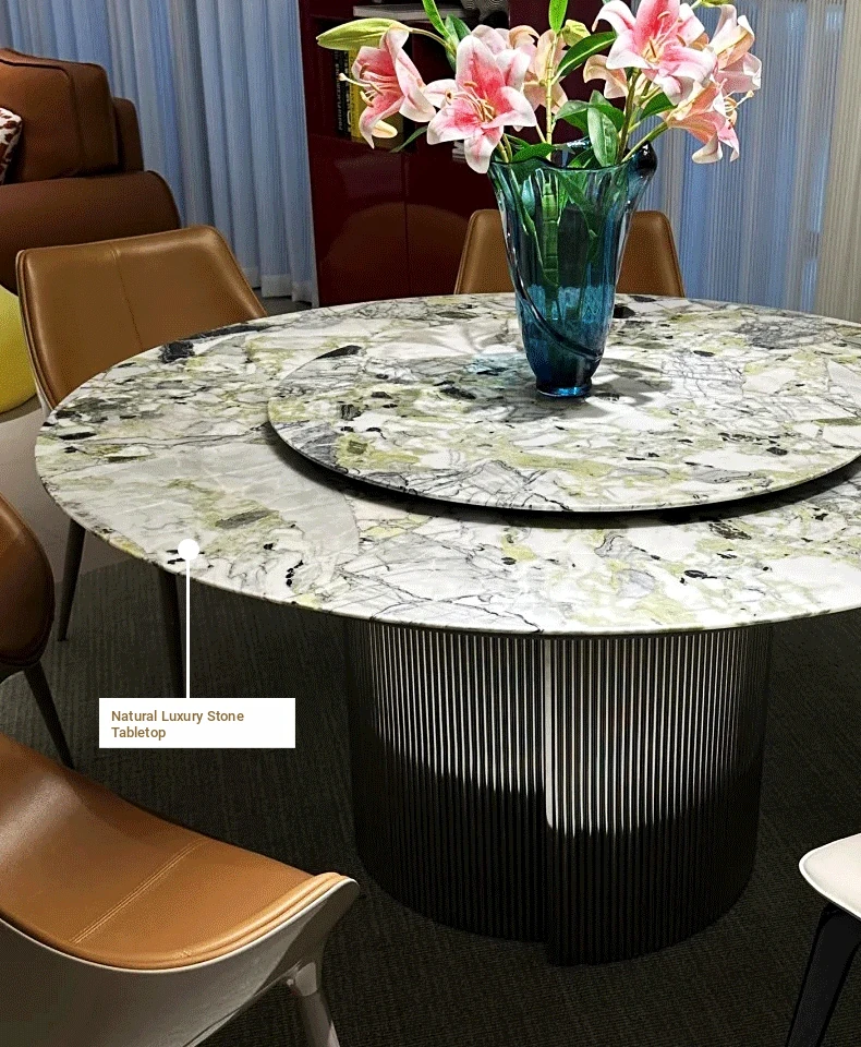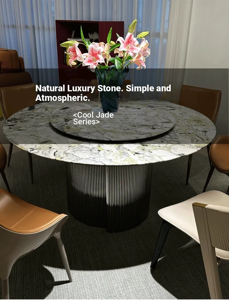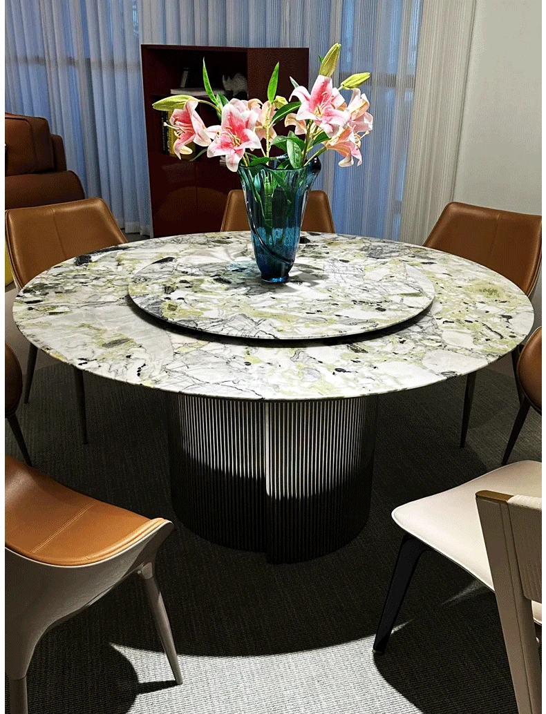 Imported Cold Jade Luxury Stone Dining Table - Elegant Italian High-End Round Marble Table for Villas with Rotating Tray - Perfect for Upscale Dining Experiences