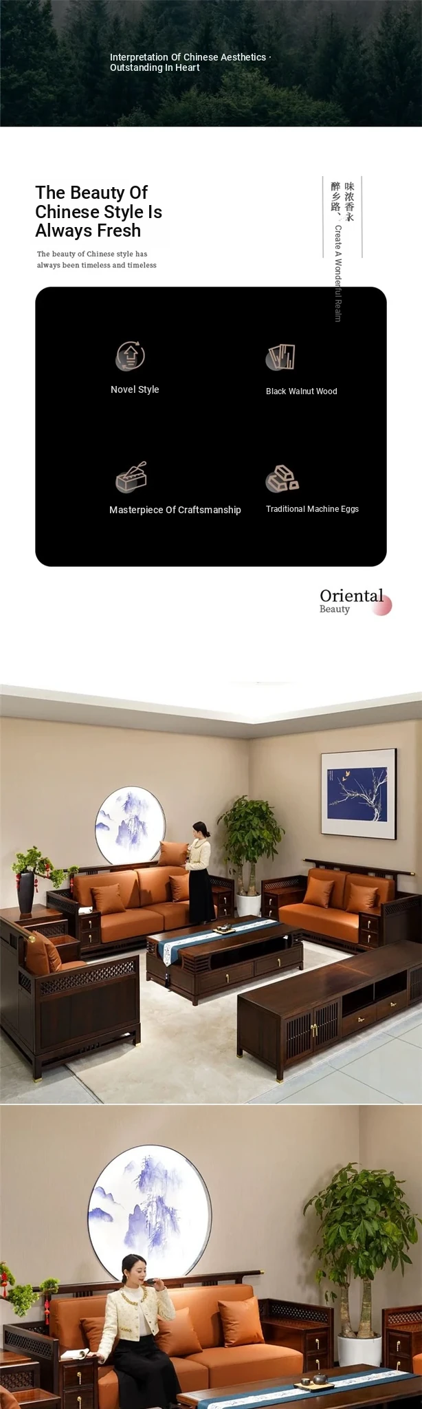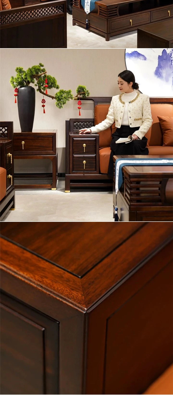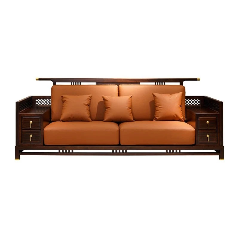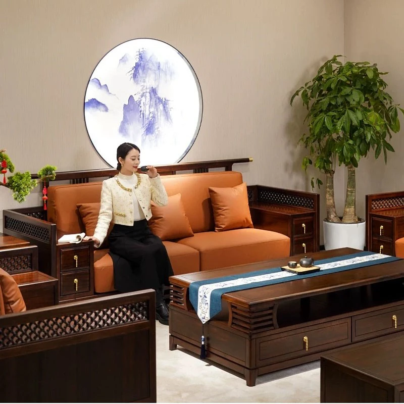 Modern New Chinese Style Black Gold Wood Solid 123 Sofa Set - Luxury Genuine Leather and Fabric Soft Pack Sofa for Spacious Living Rooms