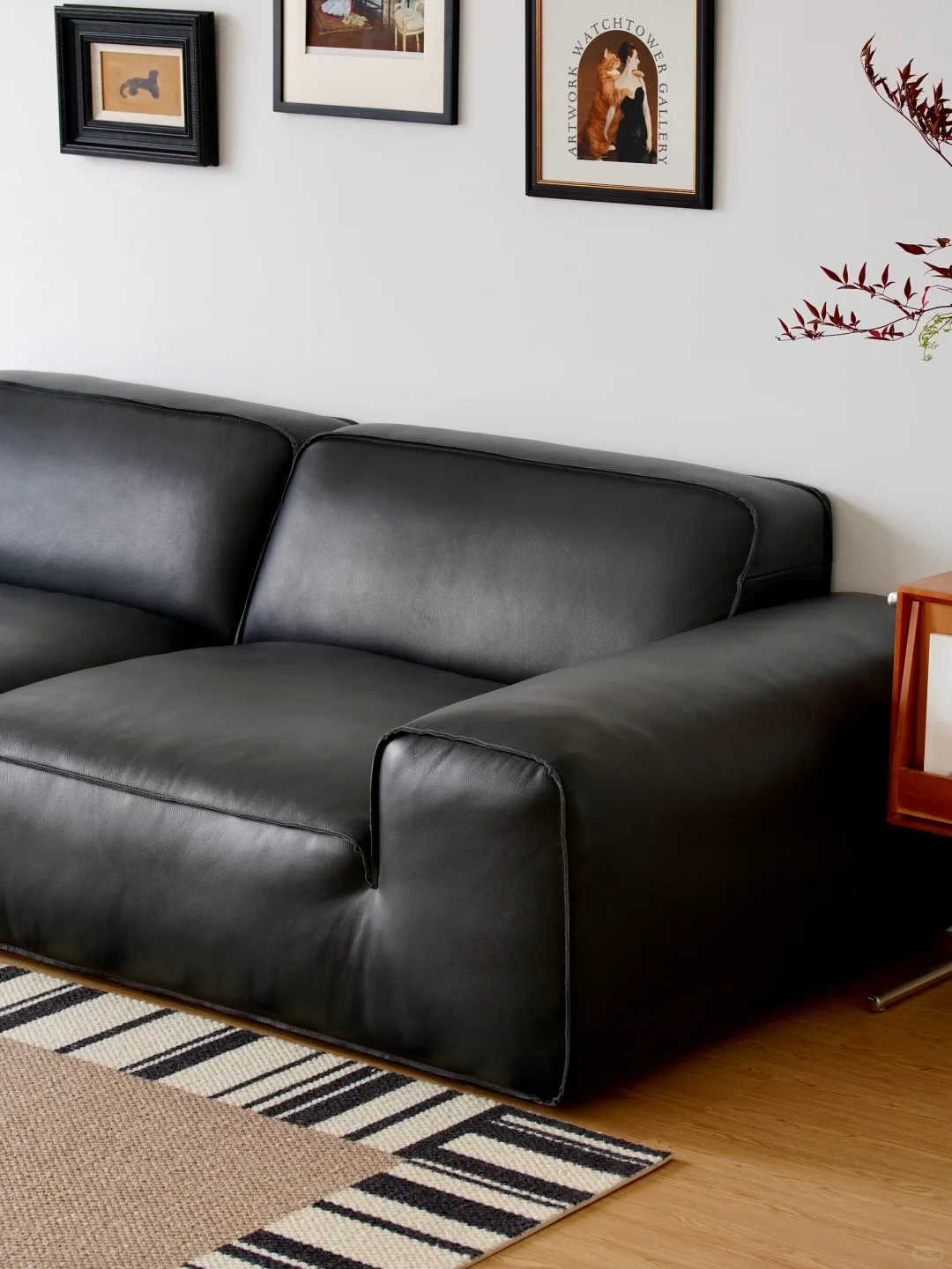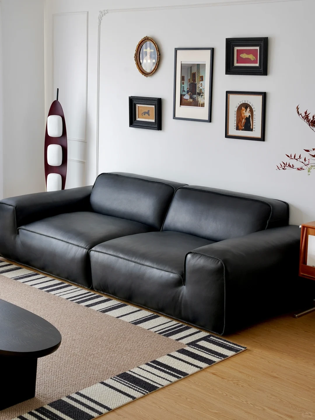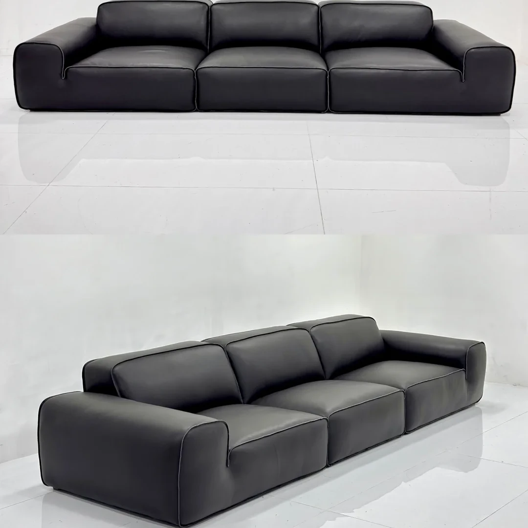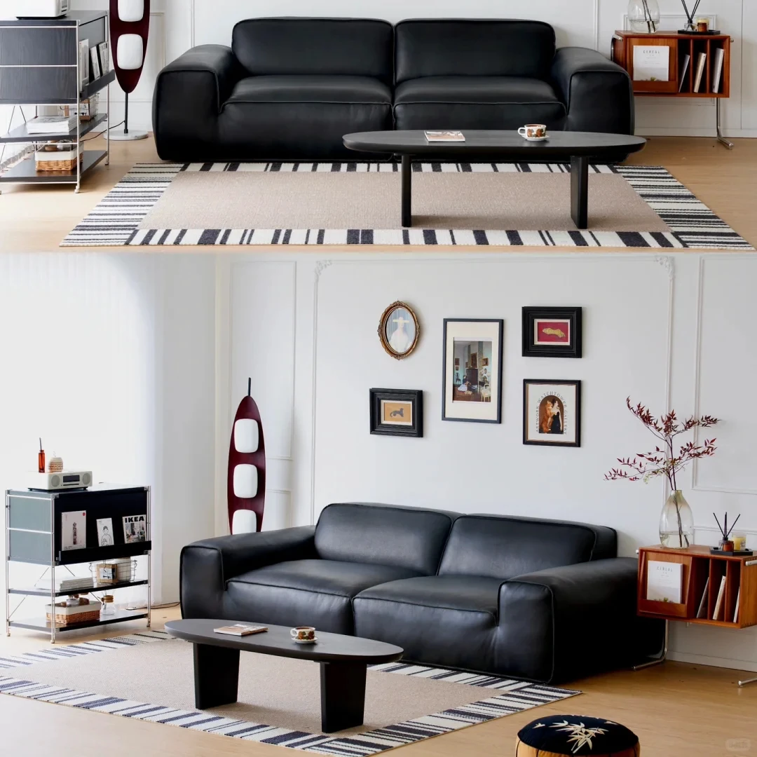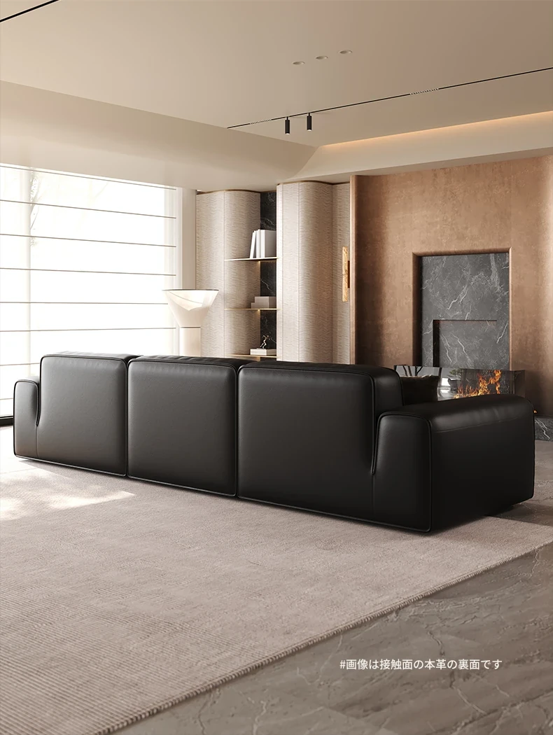 2025年新作!イタリアンスタイルの大黒牛革ソファセット - ブラックトーフブロックデザイン、小型リビングに最適、最高級の本革使用で贅沢な座り心地を実現!