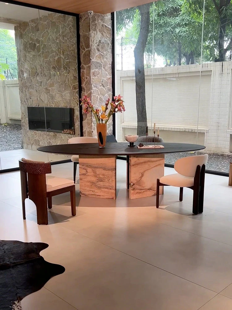 輸入天然大理石の輸入品、ベネチアブラウンの高級ダイニングテーブル。デザイナーが手掛けた高級別荘向け、洗練されたイタリアンラグジュアリーの食卓を演出します。上質な素材で特別なひとときをお楽しみください。