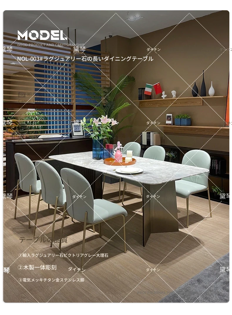 阅恒家具の天然大理石を使用した高級フィンディホワイトロングテーブル - 新しいデザインの無垢材とステンレス脚の長方形テーブル、家庭に最適!