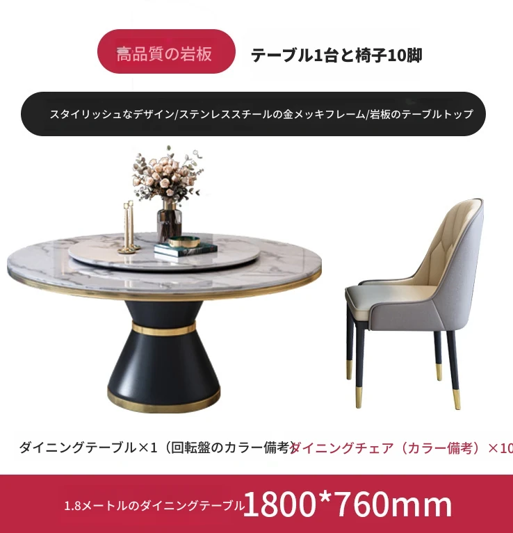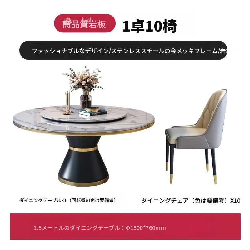 1.5メートル円卓+10スペースチェア【金縁付き】 (注文すると回転台進呈)
