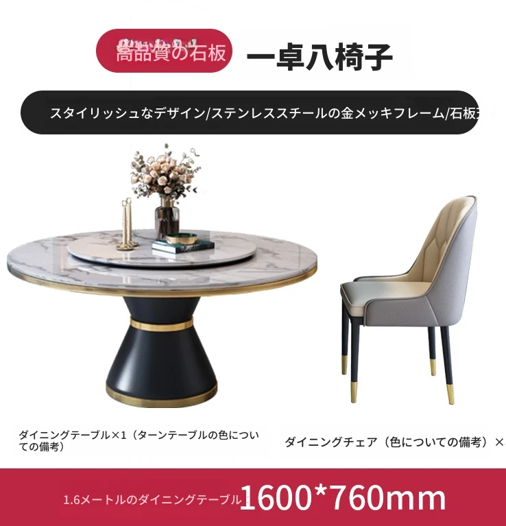 1.6メートル円卓+8スペースチェア【金縁付き】 (注文すると回転台進呈)
