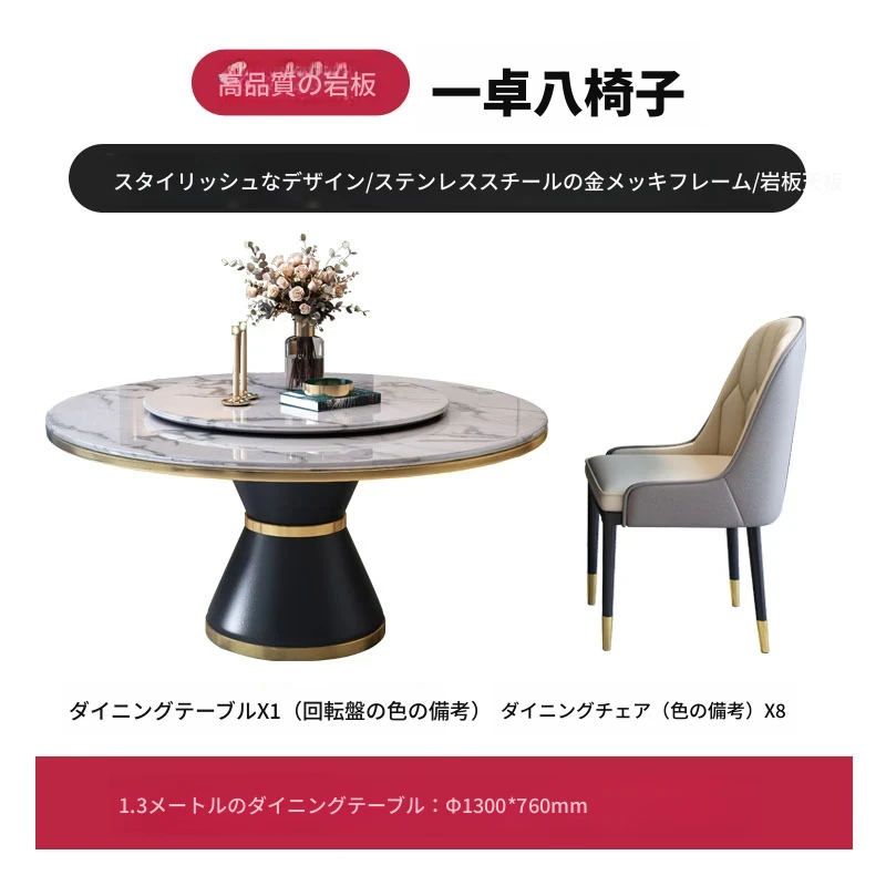 1.3メートル円卓+8スペースチェア【金縁付き】 (注文すると回転台進呈)
