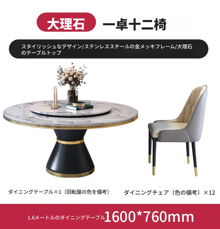 1.6メートル円卓+12スペースチェア【金縁付き】 (注文すると回転台進呈)