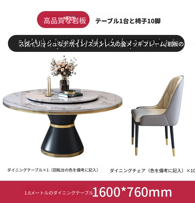 1.6メートル円卓+10スペースチェア【金縁付き】 (注文すると回転台進呈)