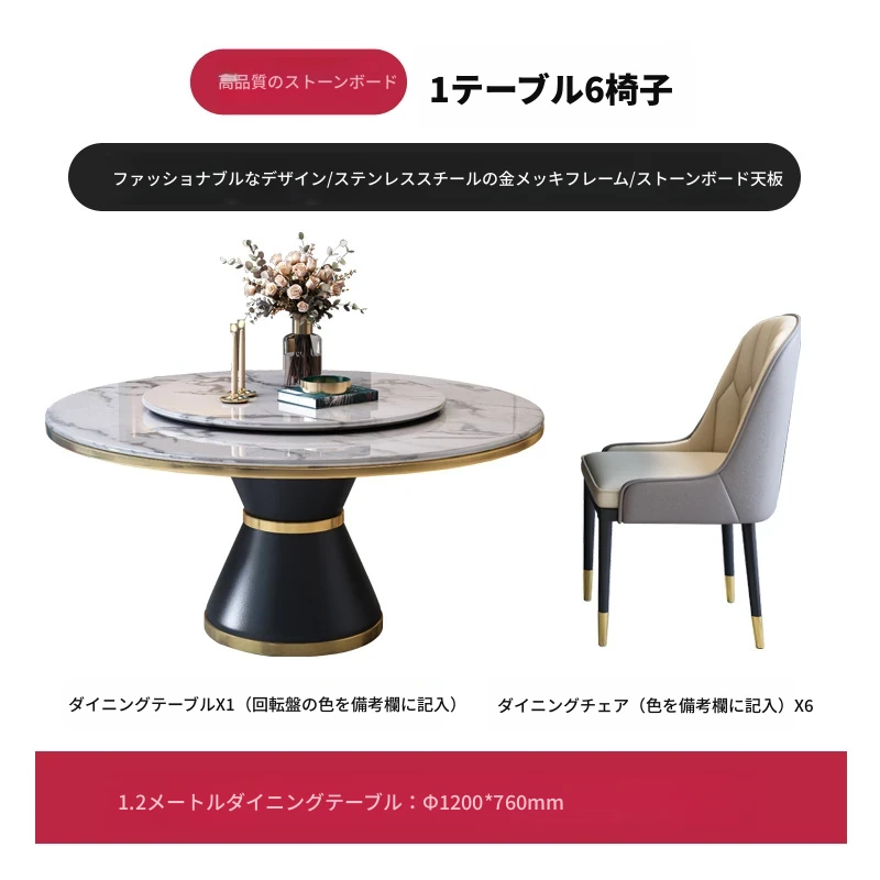 1.2メートル円卓+6スペースチェア【金縁付き】 (注文すると回転台進呈)
