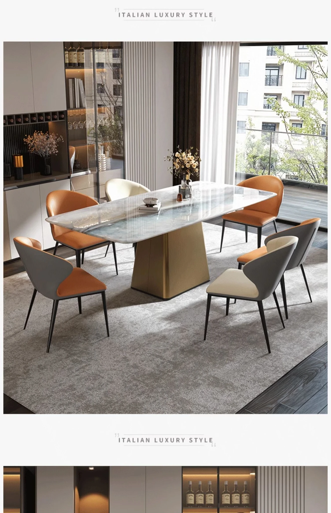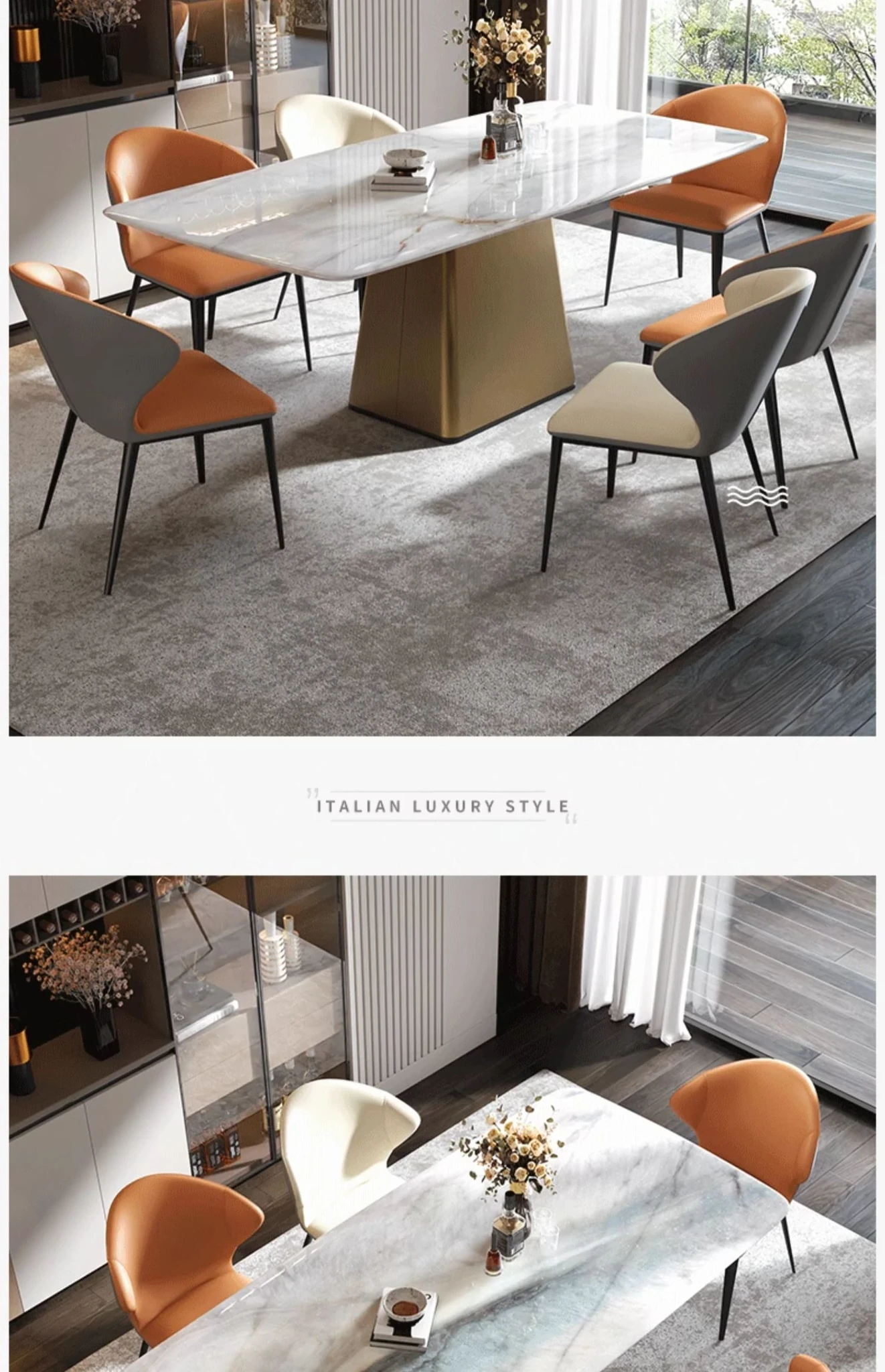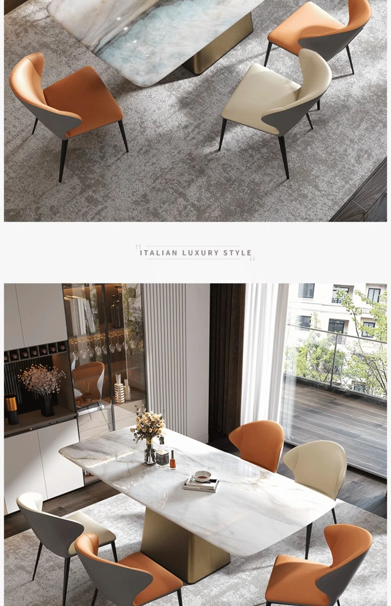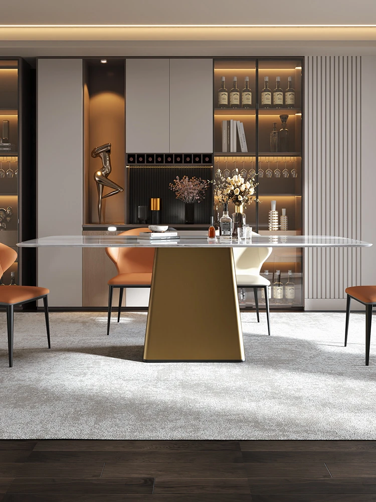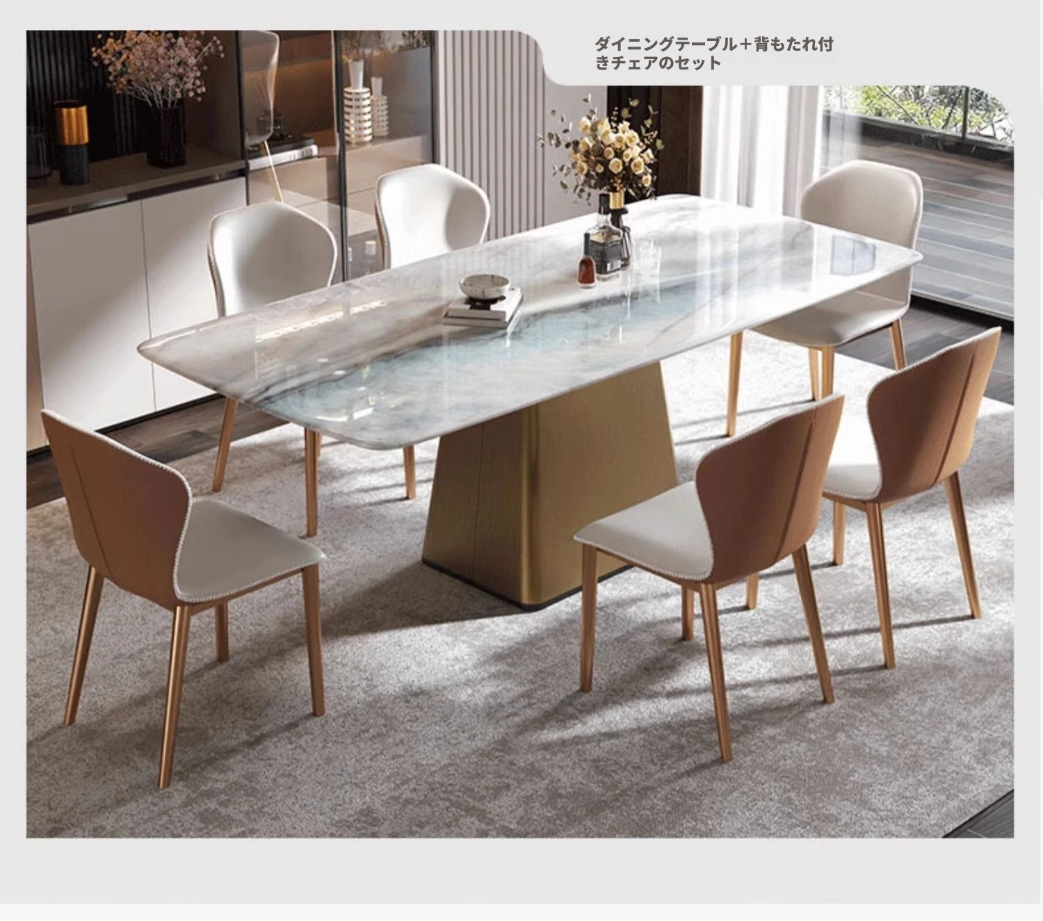 高級感溢れる天然大理石ダイニングテーブルとチェアのセット - 別荘やレストランに最適な光沢のあるデザイン、贅沢な石材と美しいカラークリスタルが魅力の家庭用食卓。