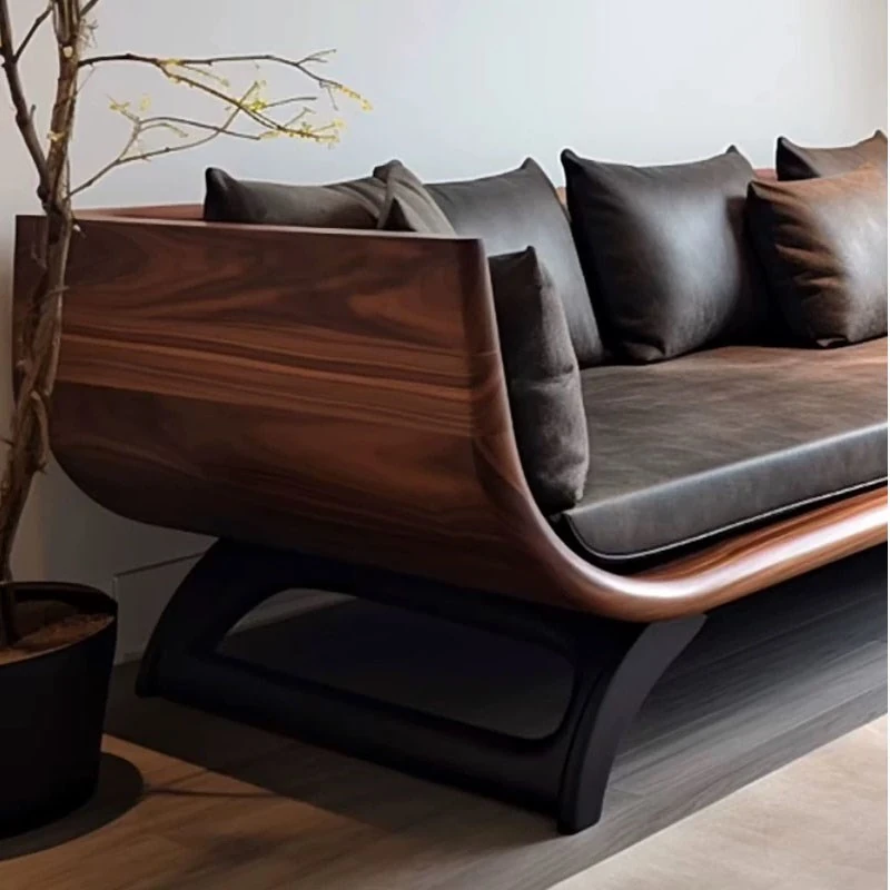 新中式スタイルの本格木製ソファ - ブラックウォールナット使用、リビングルームにぴったりな軽やかで贅沢なミニマリズム。高品質な本革仕上げ、別荘にも最適なソフトパッケージ家具セット!