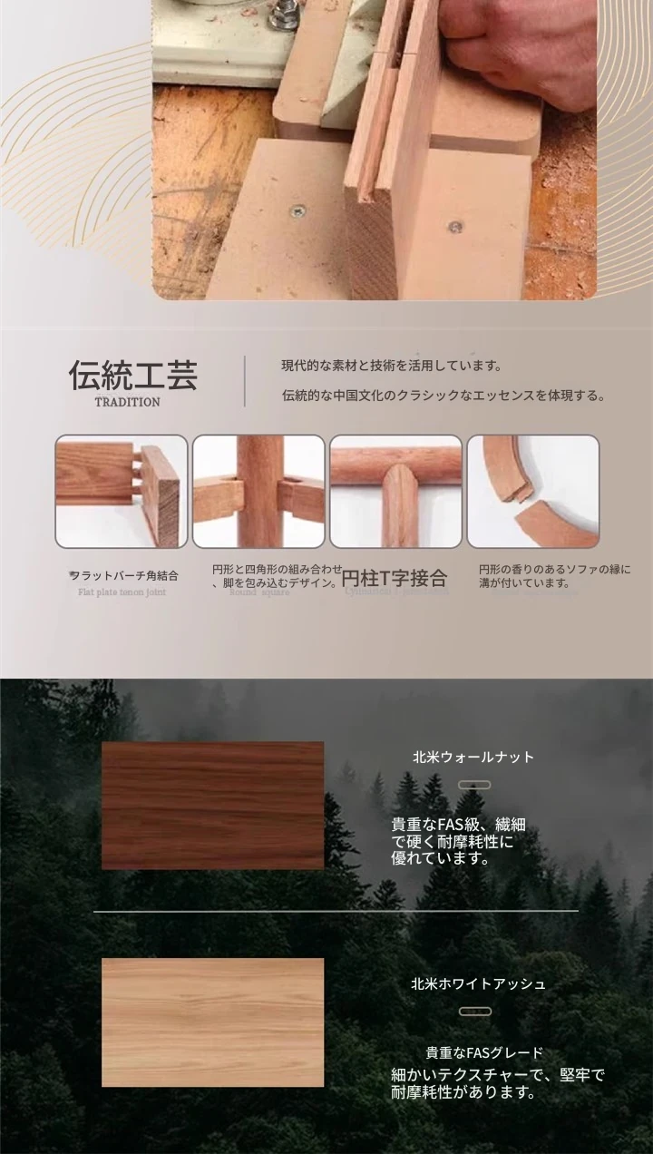 新中式高級無垢材ソファセット - ホワイトアッシュの温もりと現代的な禅の美しさを融合。シンプルでありながら洗練されたデザイン、ウッドグレインが魅力的なウッディブラックウッド。あなたのリビングに特別な空間を演出します。