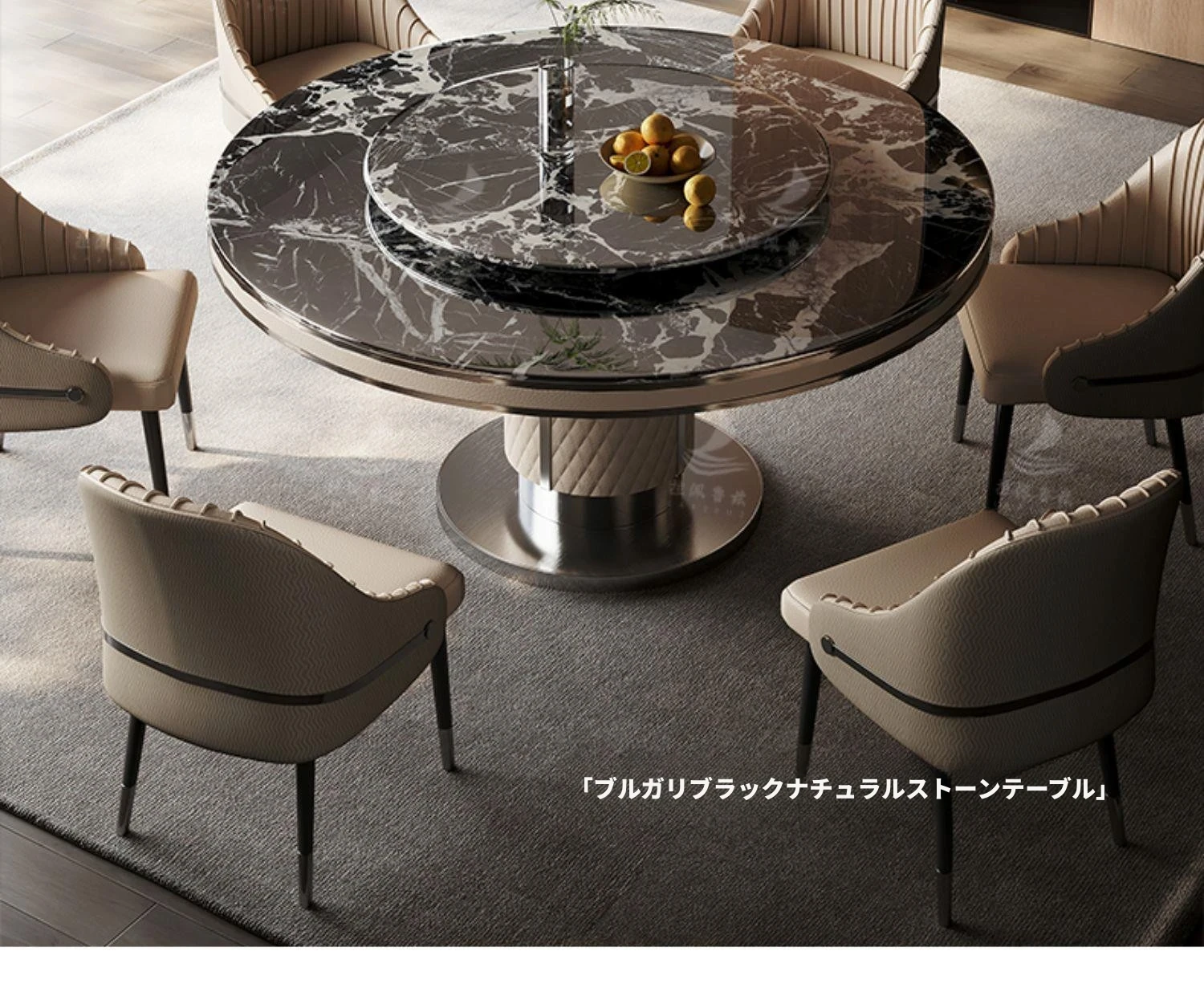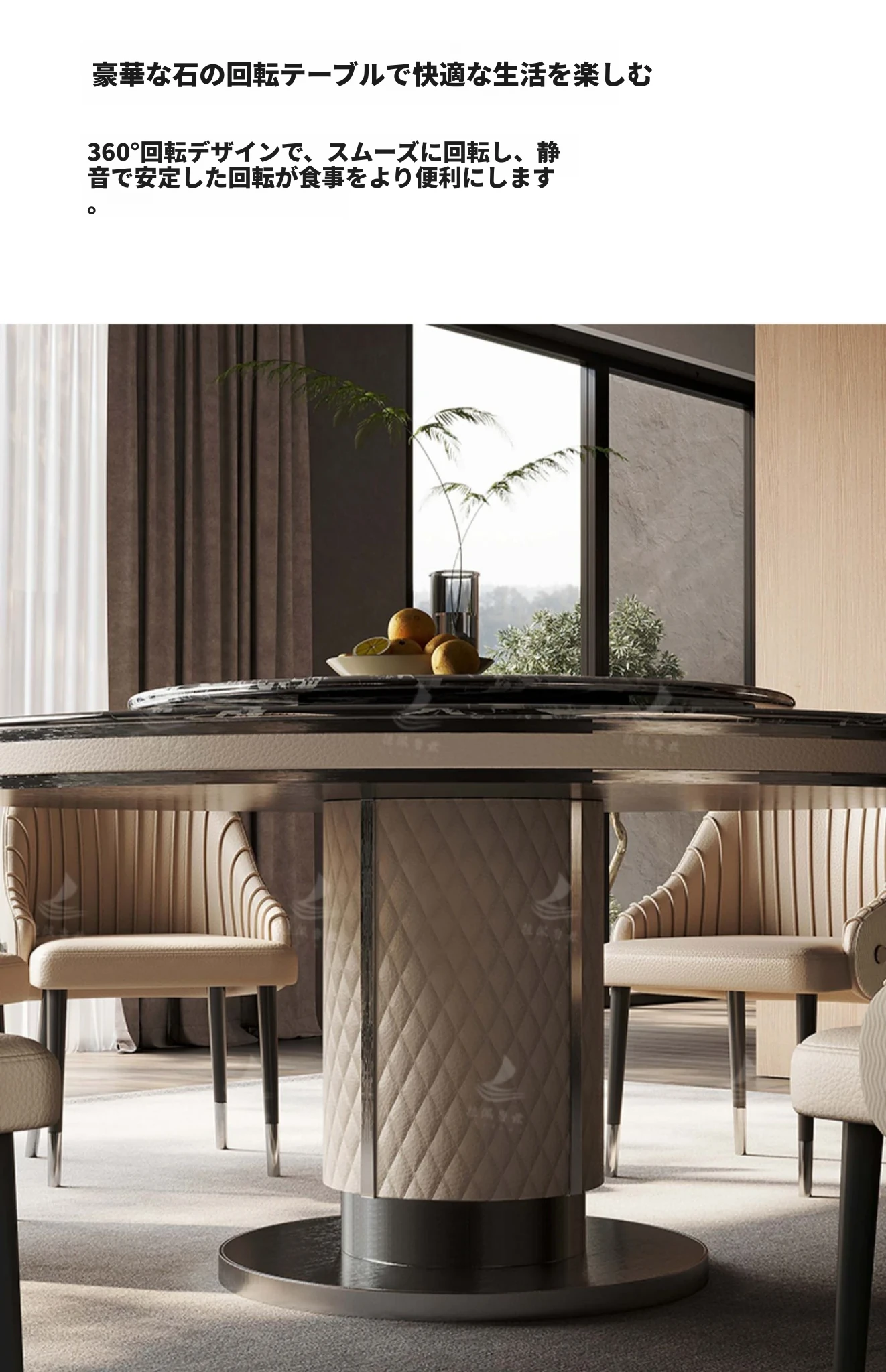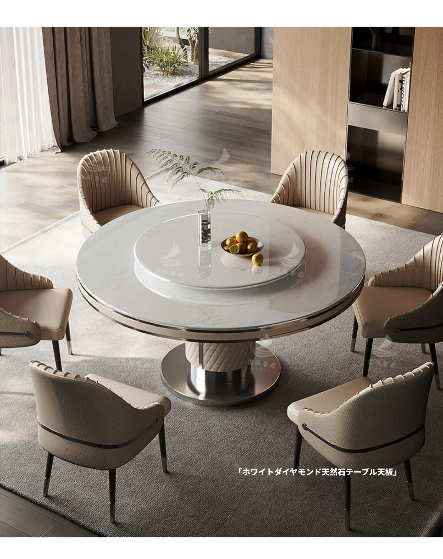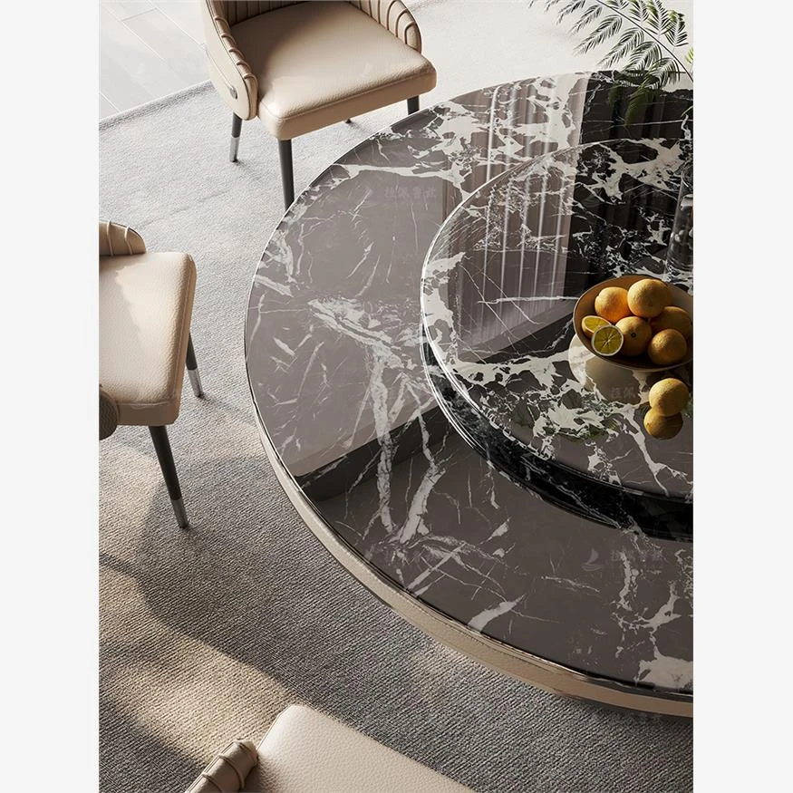 ラグジュアリーな大理石製の円形ダイニングテーブル、回転トレイ付き!モダンな別荘にぴったりの高級感あふれるデザイン。家庭用にも最適で、あなたの空間を一層魅力的に演出します。