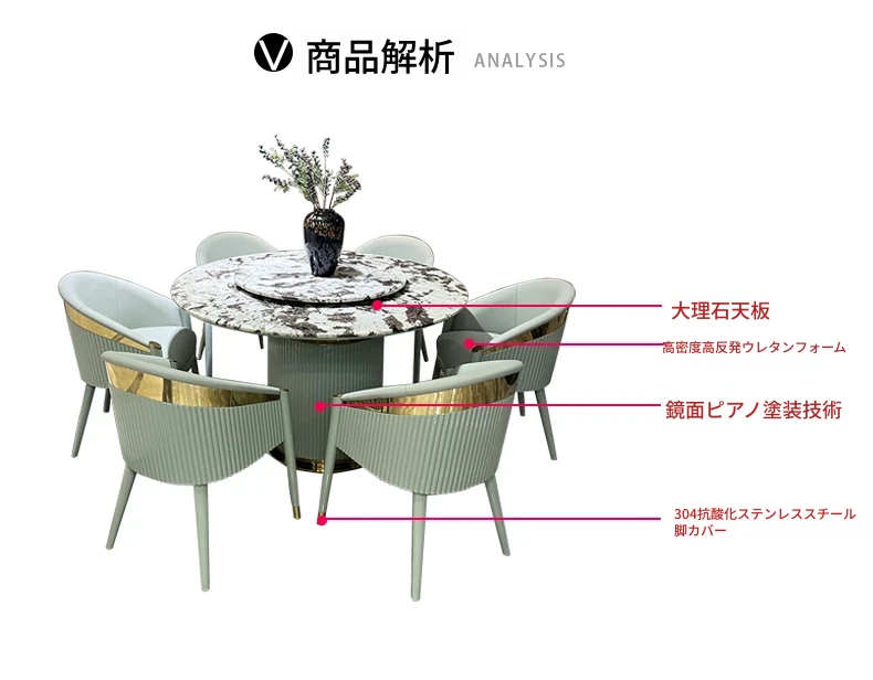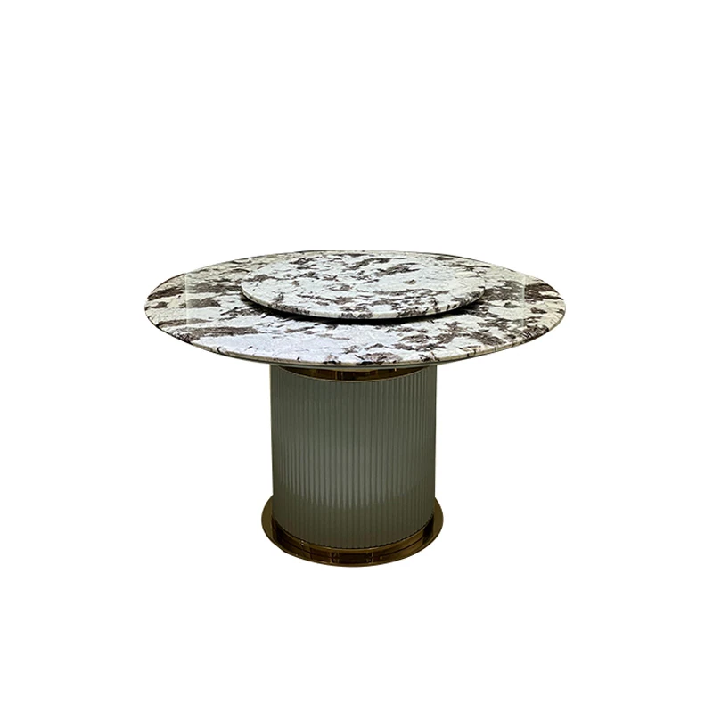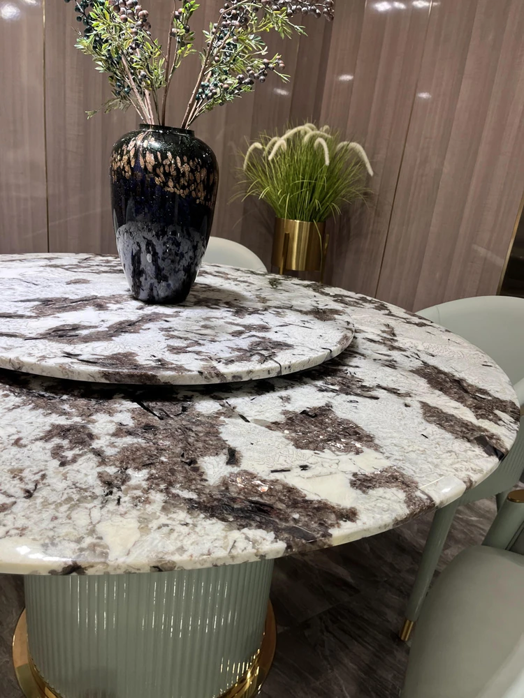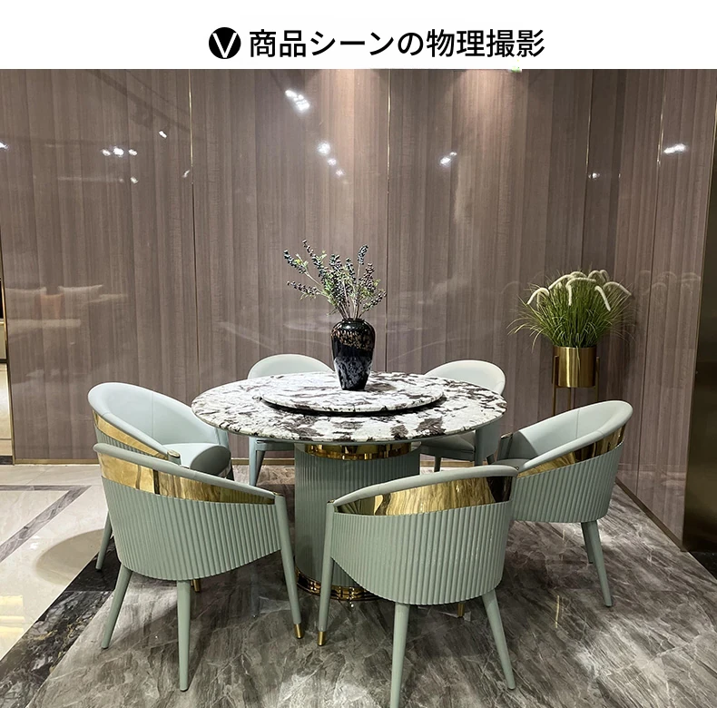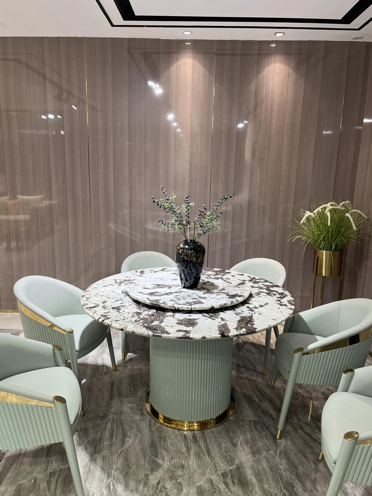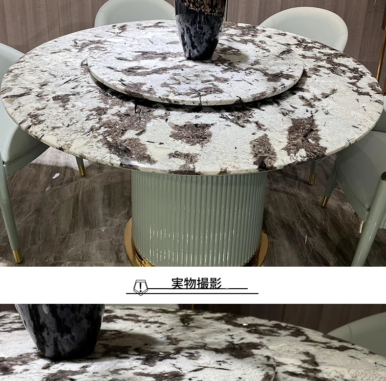 高級ラグジュアリー石製ダイニングテーブルセット|現代的で洗練された円形テーブルと椅子の組み合わせ|別荘にぴったりな大理石製、回転プレート付きの食卓で贅沢な食事体験をお楽しみください。