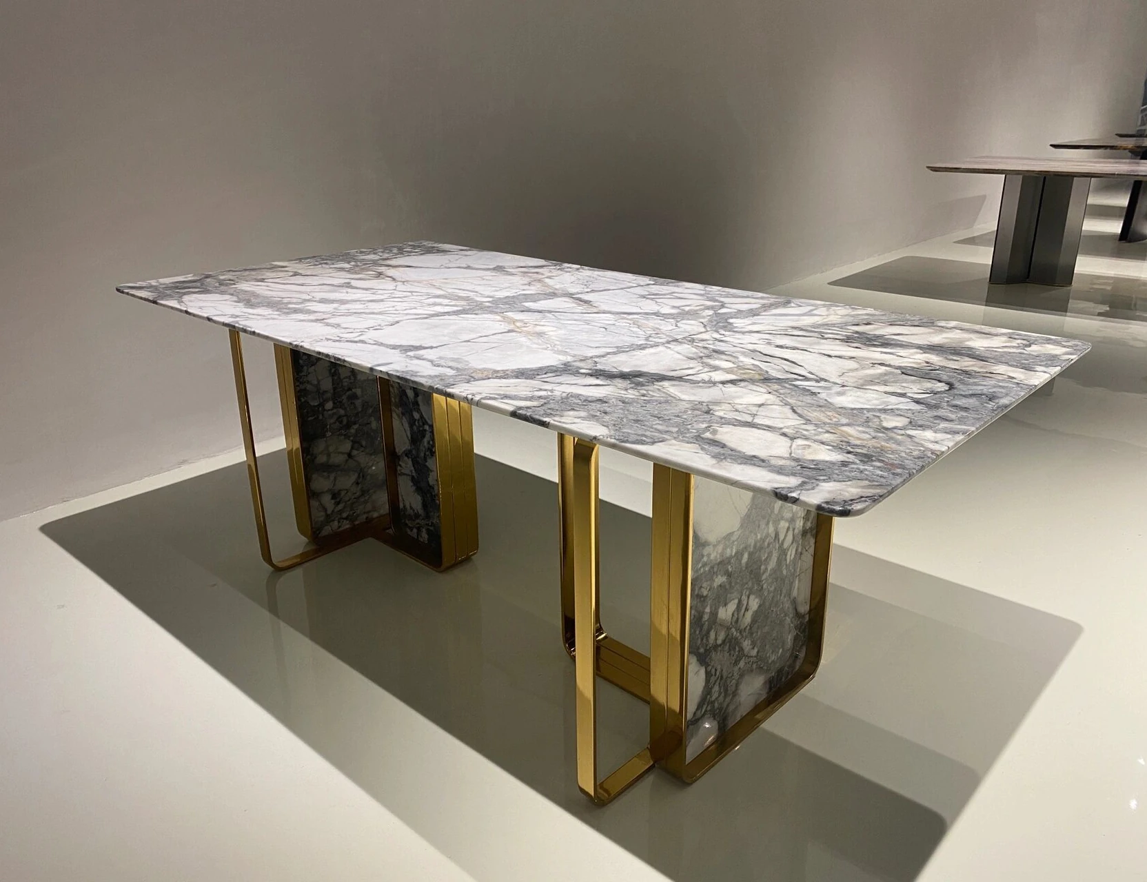 阅恒家具の天然大理石を使用した高級フィンディホワイトロングテーブル - 新しいデザインの無垢材とステンレス脚の長方形テーブル、家庭に最適!