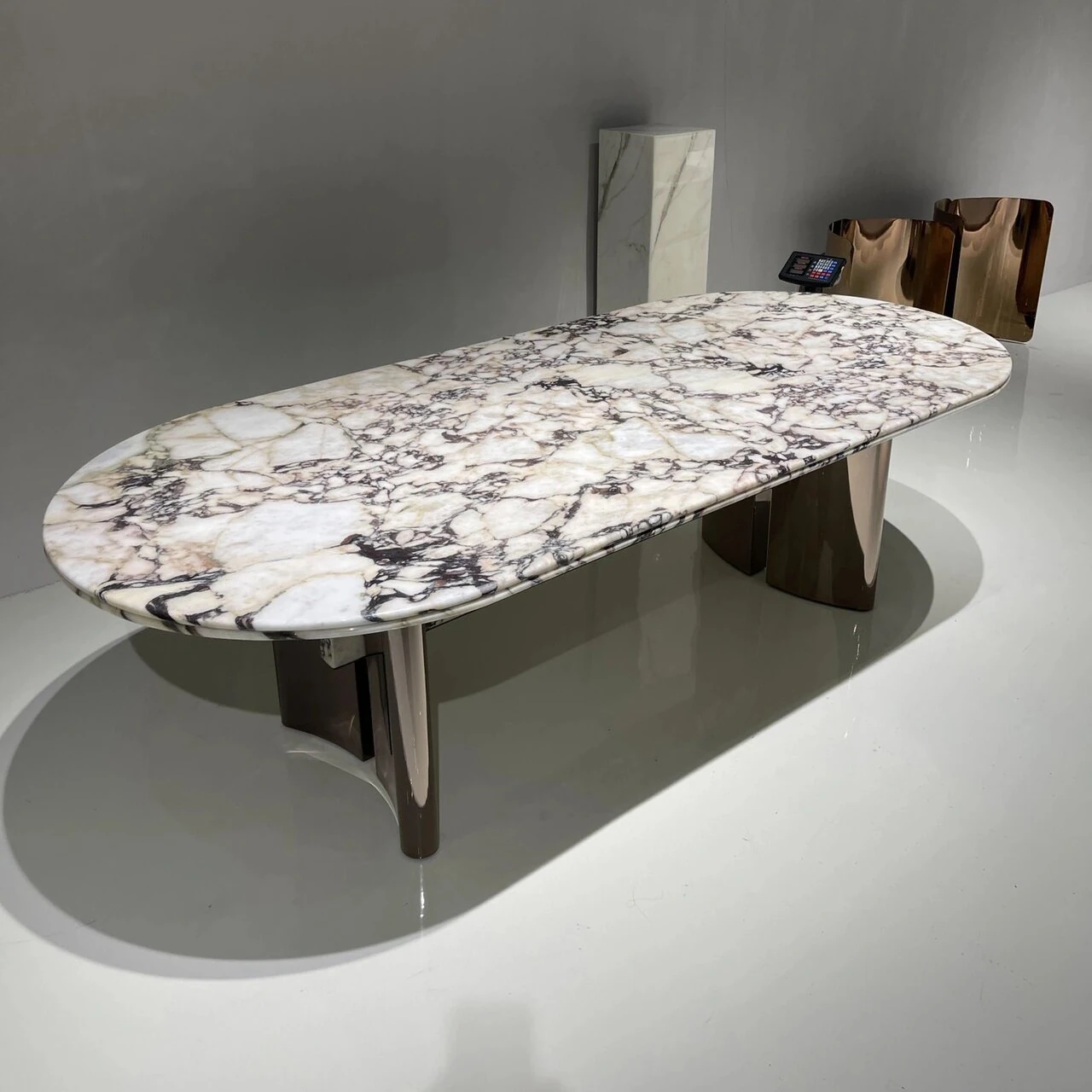 輸入天然大理石の輸入品、ベネチアブラウンの高級ダイニングテーブル。デザイナーが手掛けた高級別荘向け、洗練されたイタリアンラグジュアリーの食卓を演出します。上質な素材で特別なひとときをお楽しみください。
