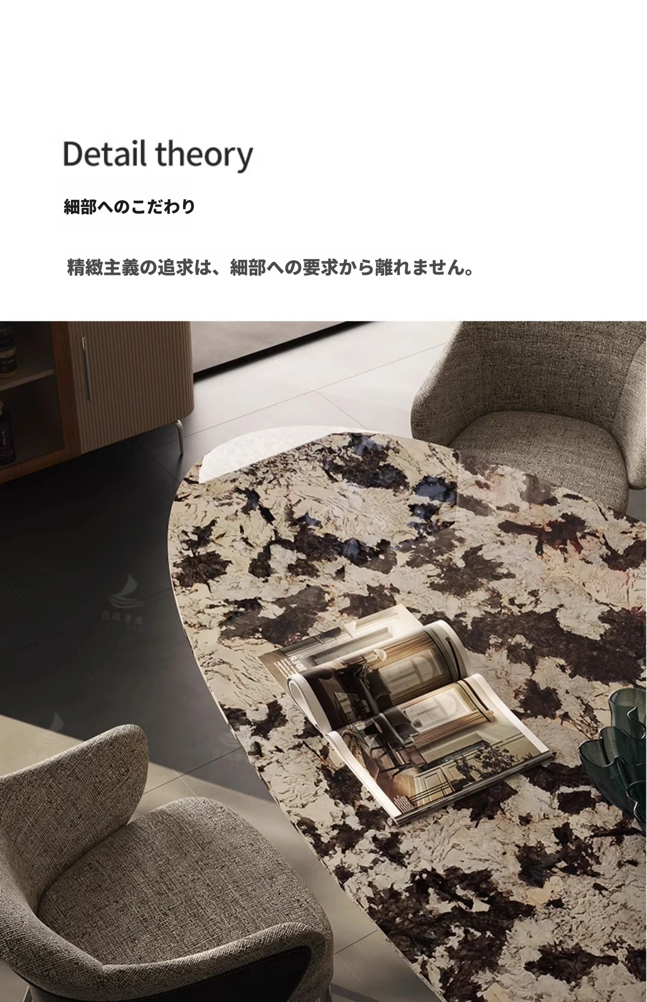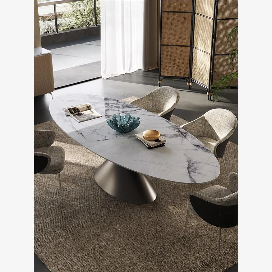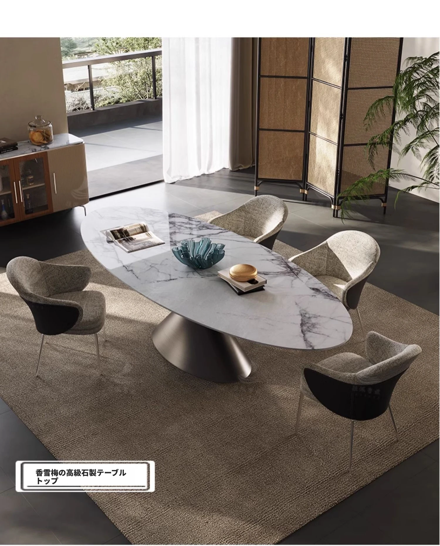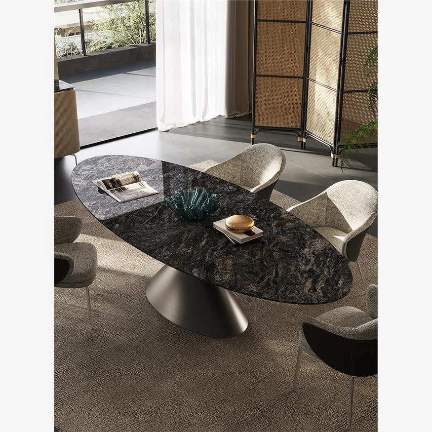 デザイン全案を実現した天然石のラグジュアリーなダイニングテーブル。モダンでシンプルな高級感を演出し、高級別荘のリビングにぴったりなエレガントな楕円形。あなたの家に特別な空間を提供します!