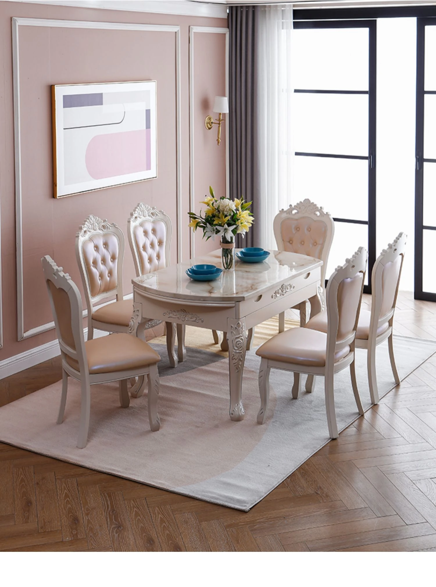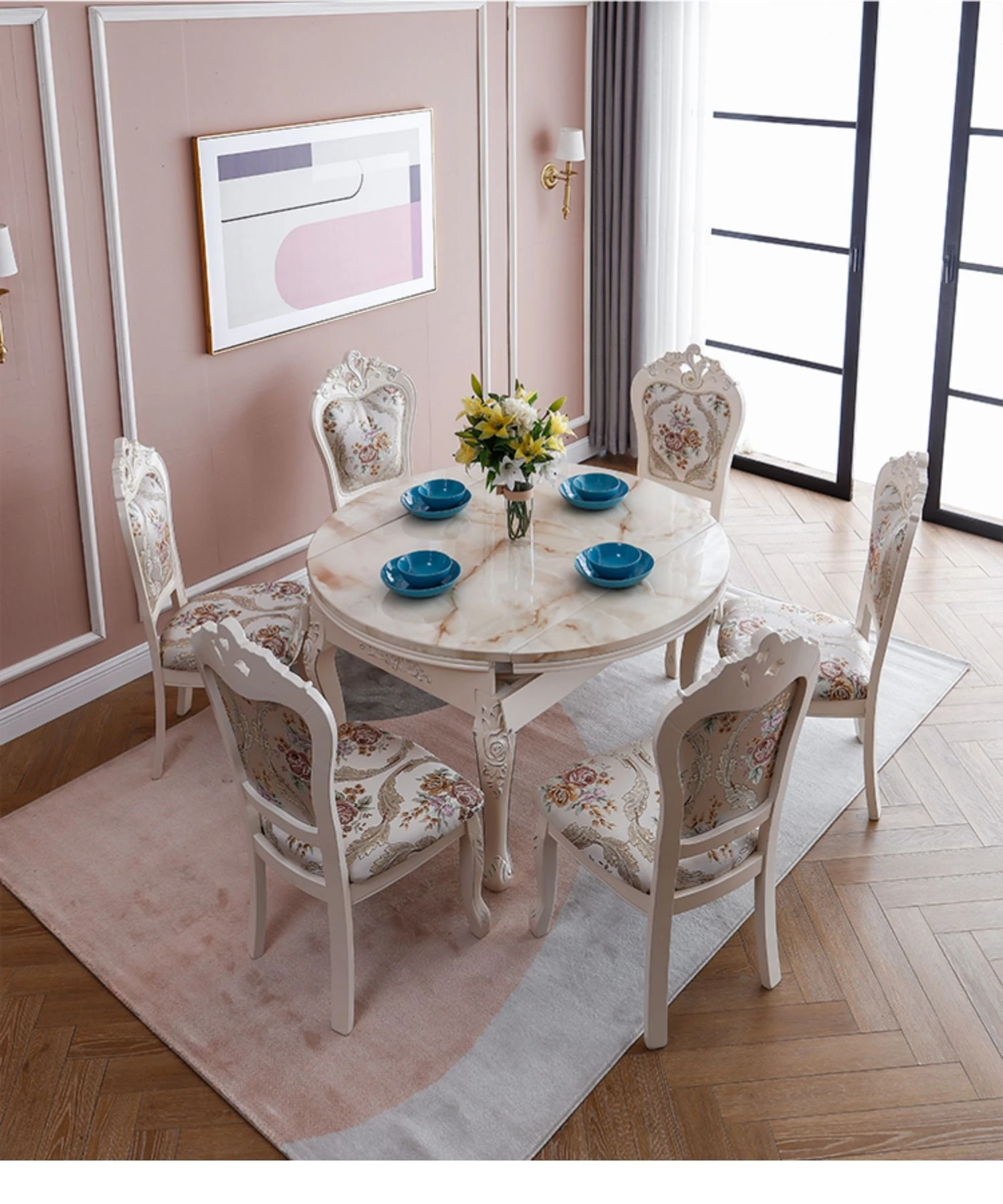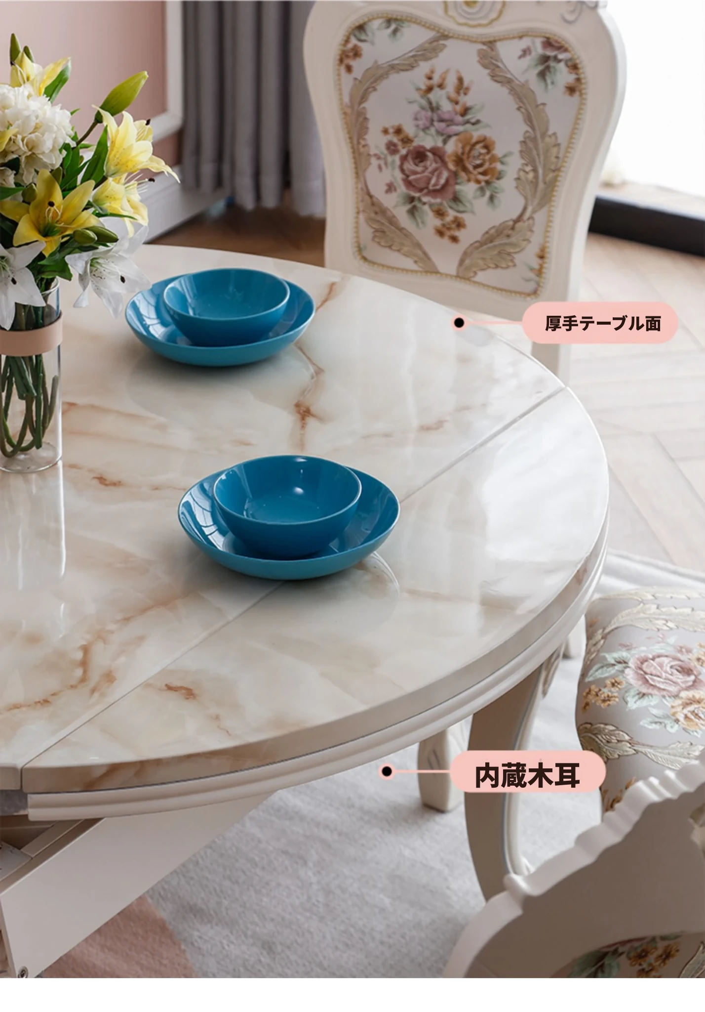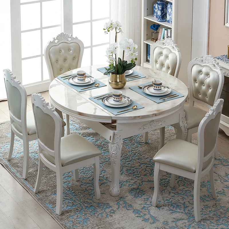 モダンでシンプルなデザインの欧風ダイニングテーブルセット!小型住居に最適な実木と大理石の組み合わせ、伸縮可能な折りたたみ式多機能ラウンドテーブルで、家族や友人との食事を楽しむ新しいライフスタイルを提案します!