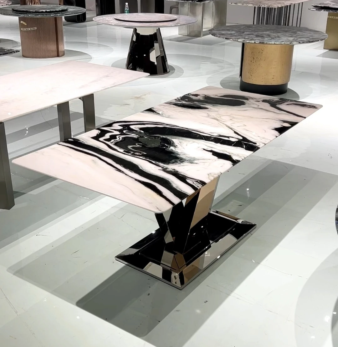 阅恒家具の天然大理石を使用した高級フィンディホワイトロングテーブル - 新しいデザインの無垢材とステンレス脚の長方形テーブル、家庭に最適!