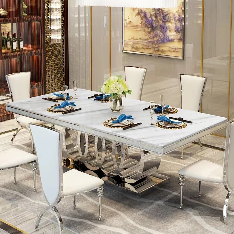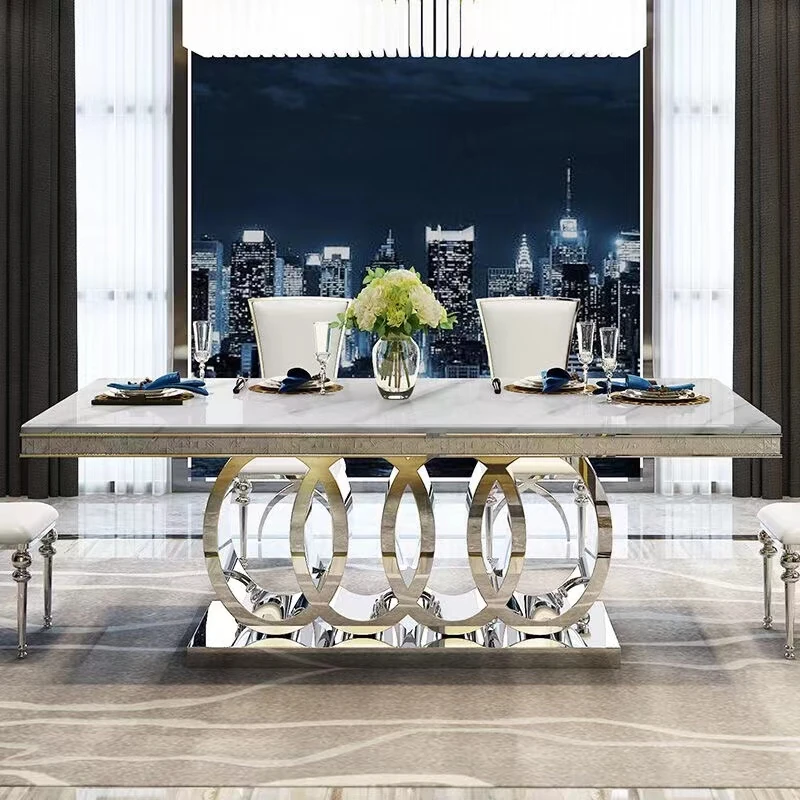 モダンでシンプルな大理石ダイニングテーブルセット!ステンレス製の長方形テーブルは、さまざまなサイズの部屋にぴったり。高級感あふれる岩板のデザインで、食卓を華やかに演出します。