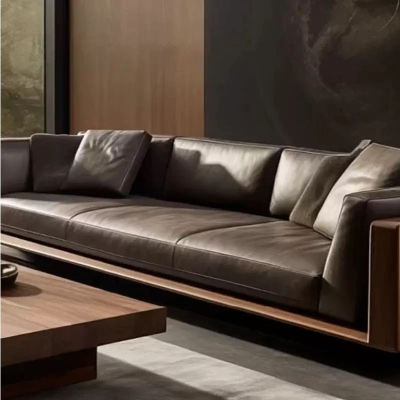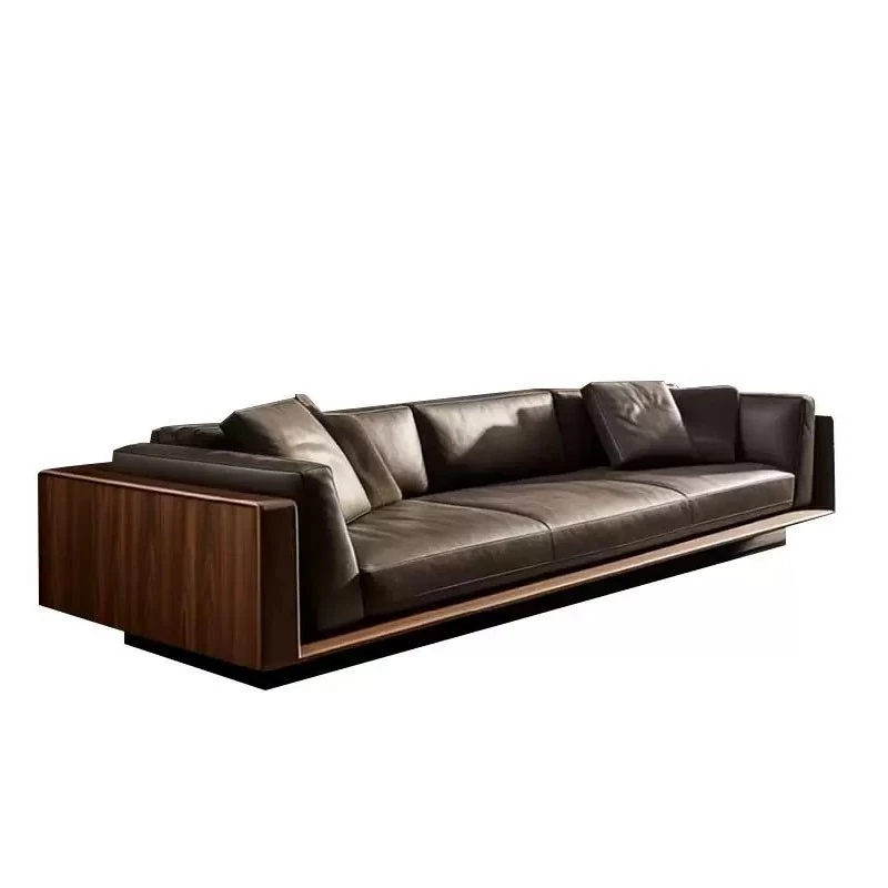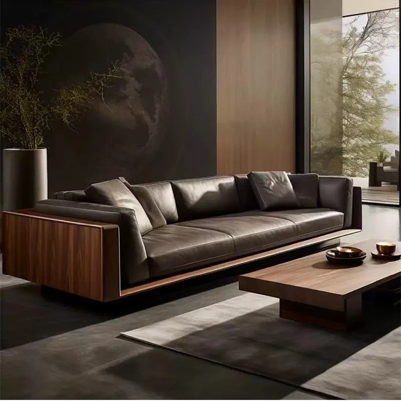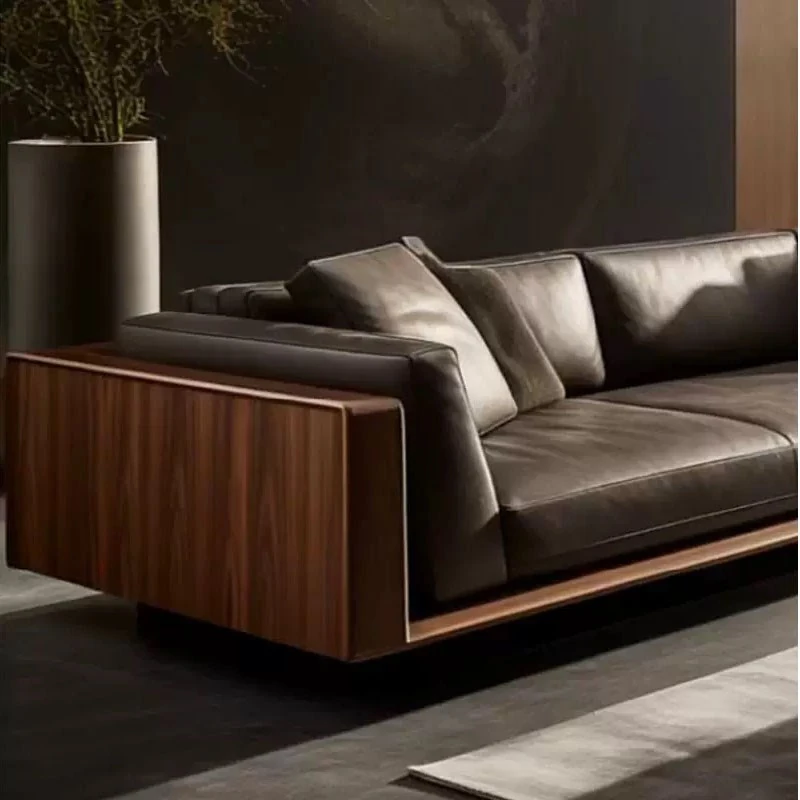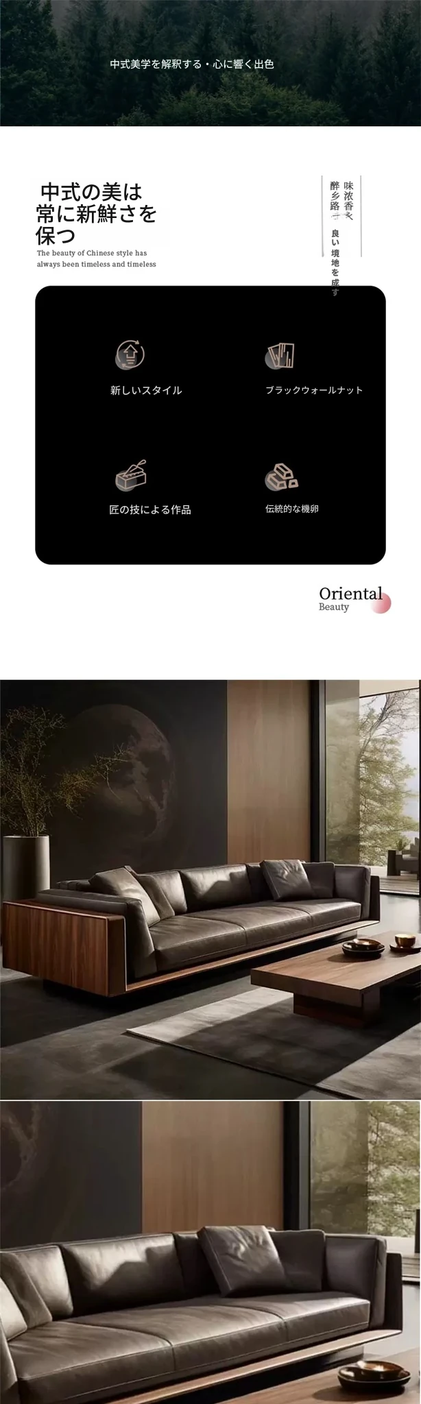 新中式デザインの北米産ブラックウォールナット木製ソファ、高級感溢れるモダンシンプルスタイル!真皮の直線的な3人掛けソファで、リビングルームを洗練された空間に演出します。