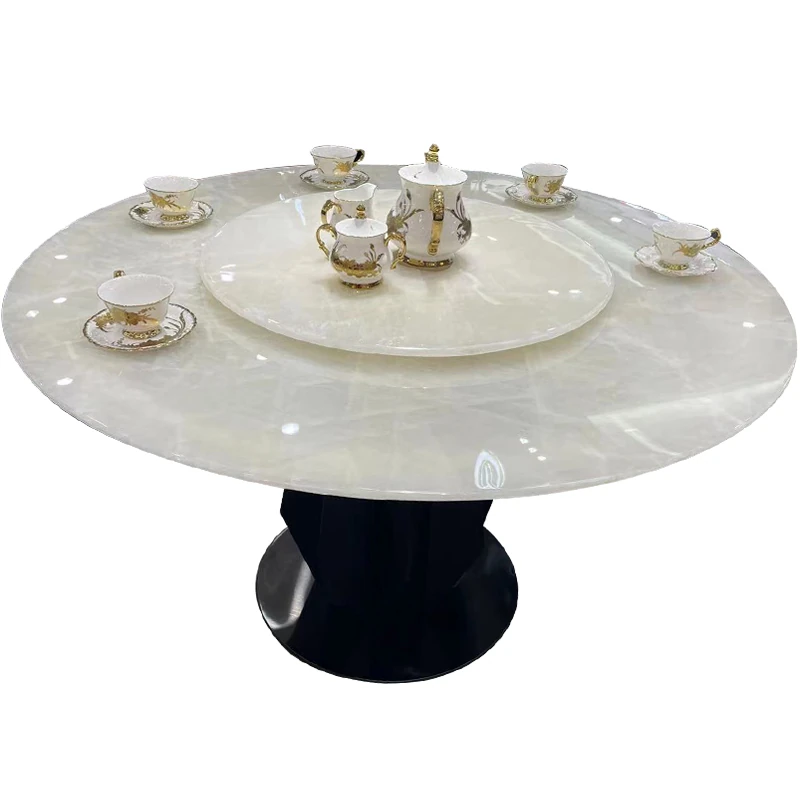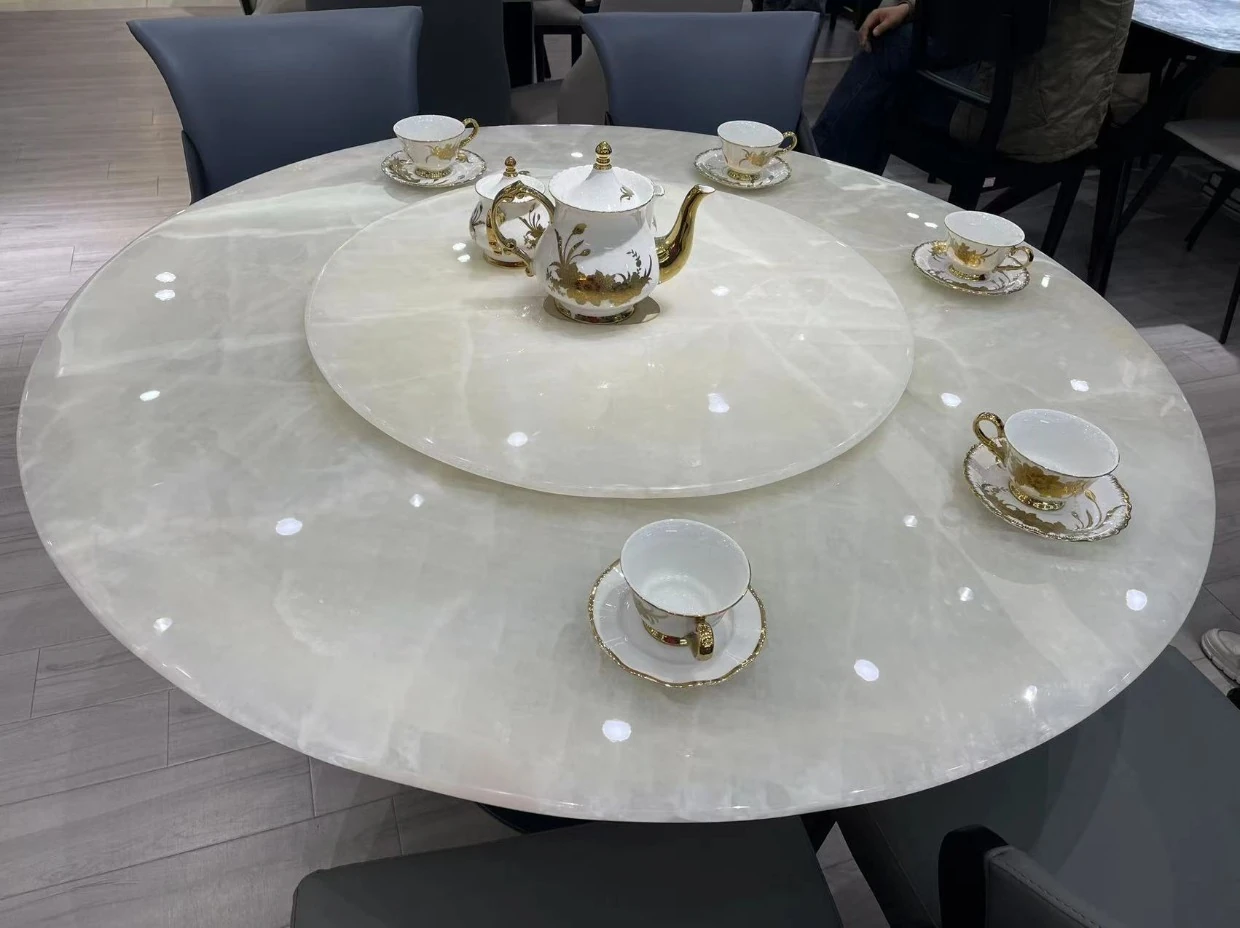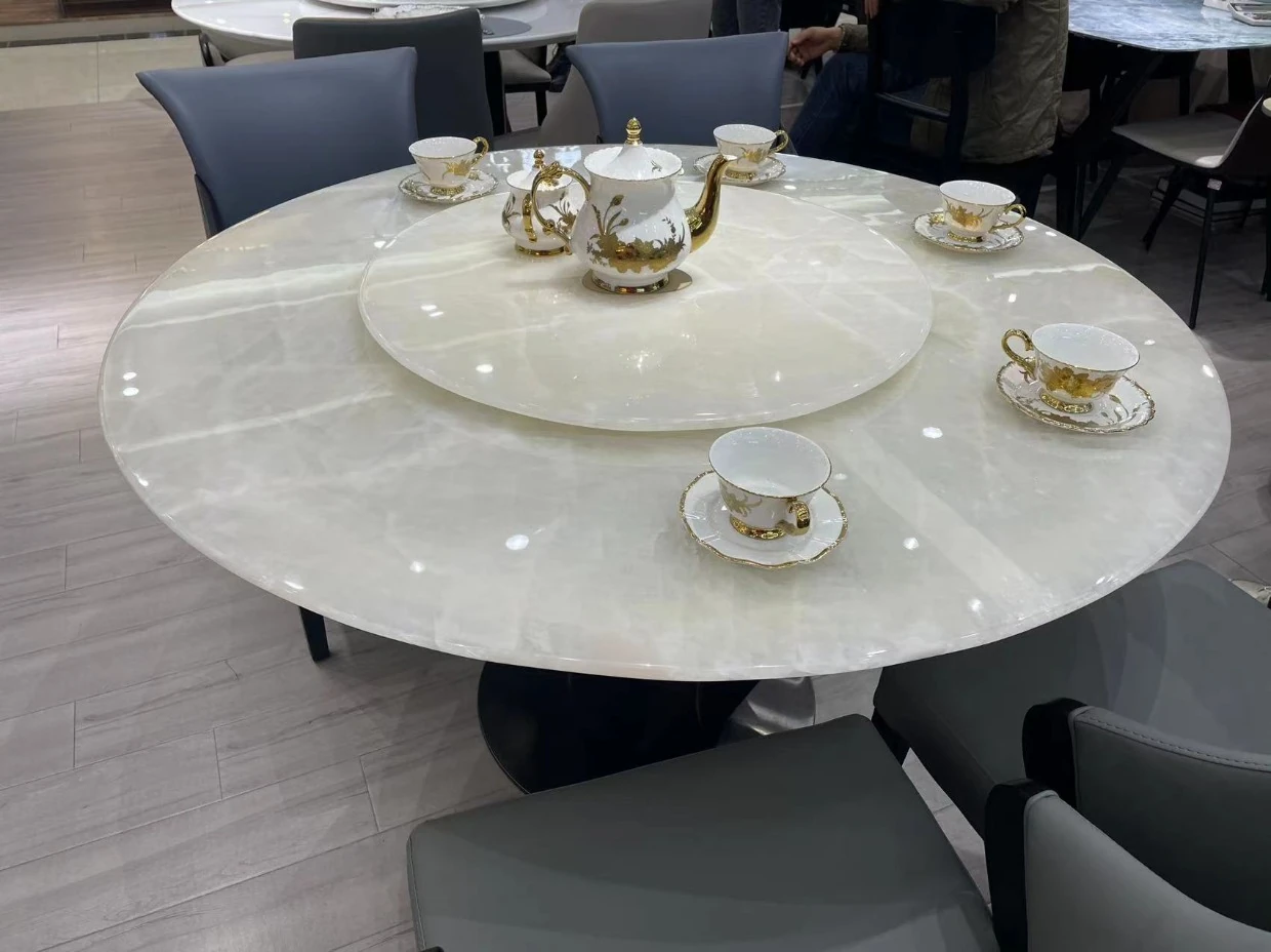 白冰玉天然大理石製のモダンシンプルな円形ダイニングテーブル - 小スペースに最適なスタイリッシュな食卓で、家族や友人との楽しいひとときを演出します!