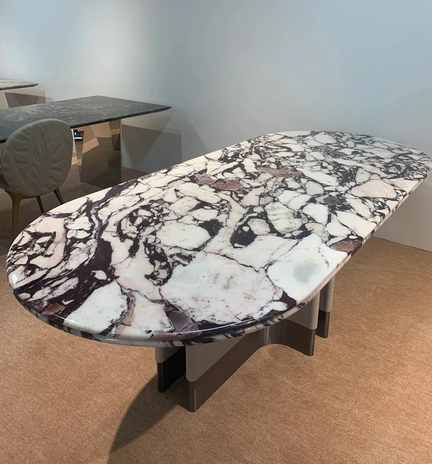 輸入天然大理石の輸入品、ベネチアブラウンの高級ダイニングテーブル。デザイナーが手掛けた高級別荘向け、洗練されたイタリアンラグジュアリーの食卓を演出します。上質な素材で特別なひとときをお楽しみください。