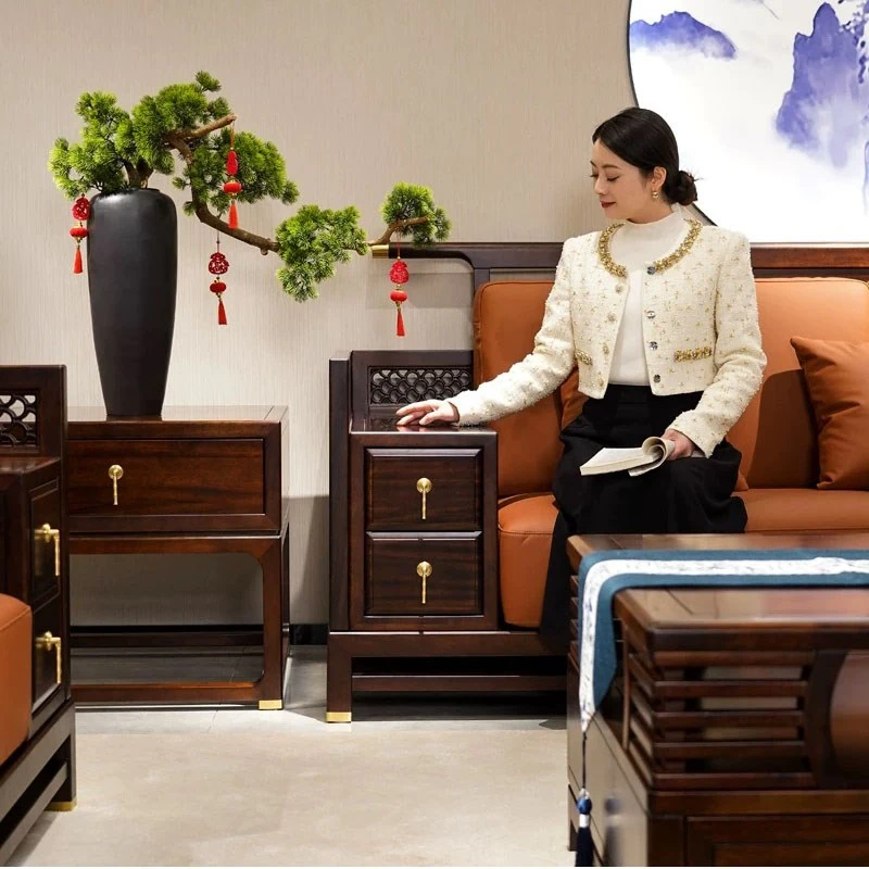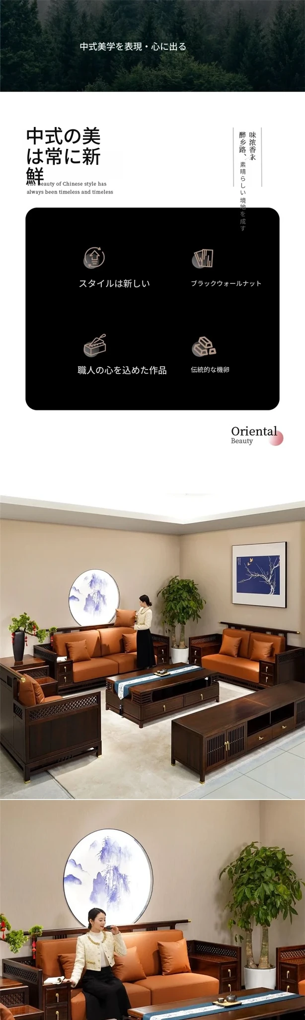 現代新中式ウッドブラックウッド無垢材123ソファセット 大型リビングに最適!本革&ファブリックのコンビネーション、快適な座り心地を提供します。おしゃれで機能的な空間を演出するための理想的なソファです!