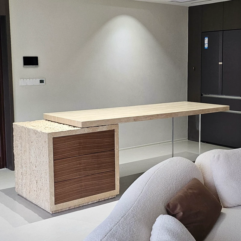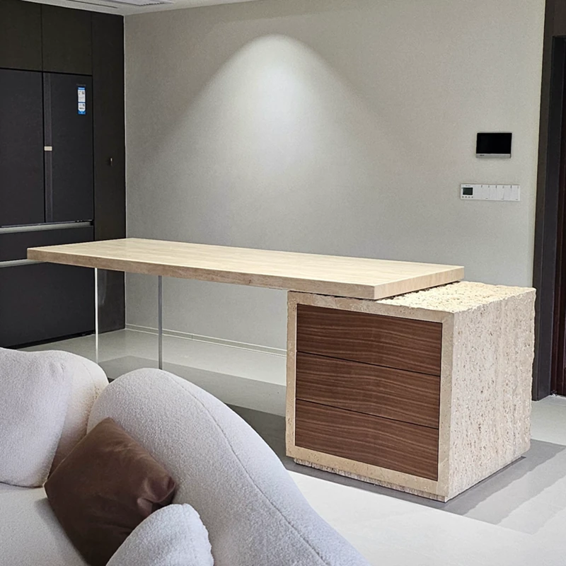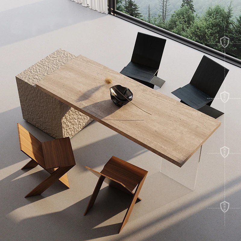 天然大理石の洞石を使用したイタリアンスタイルの極簡約モダンダイニングテーブル。大空間にぴったりなアイランドテーブルで、洗練されたデザインと高級感を演出します。おしゃれな食卓で特別なひとときをお楽しみください。