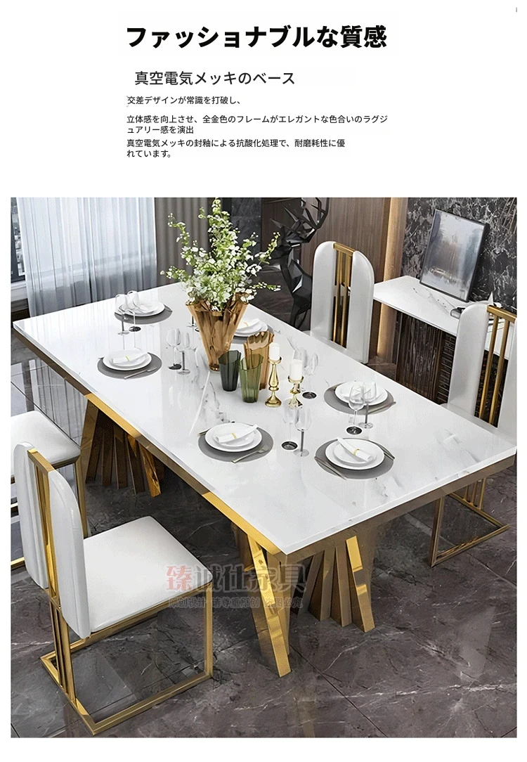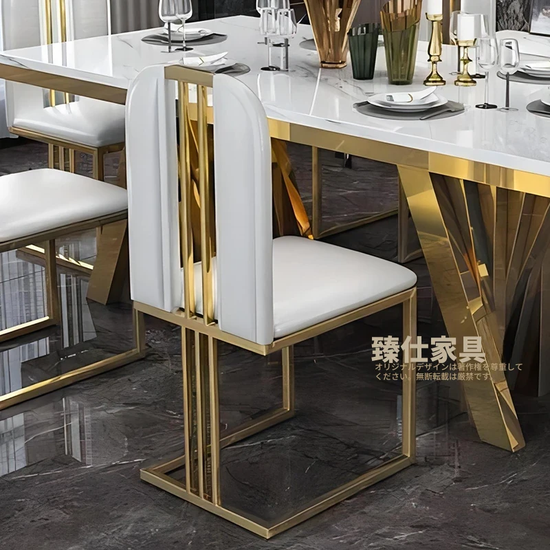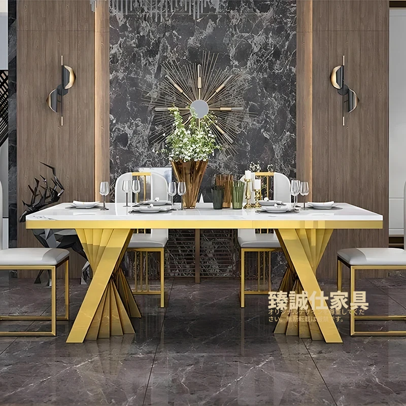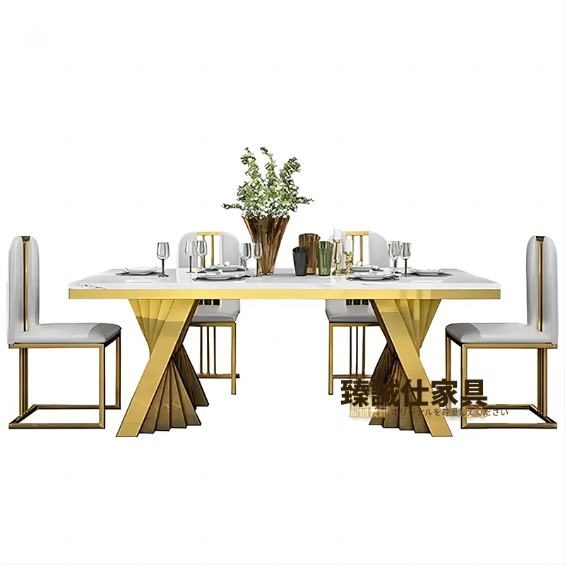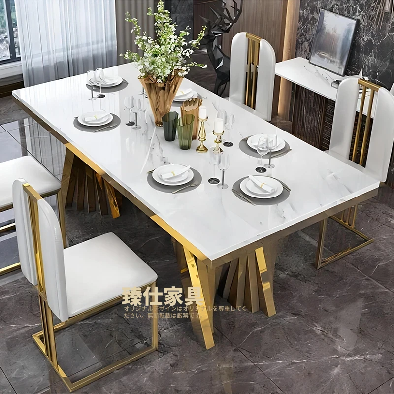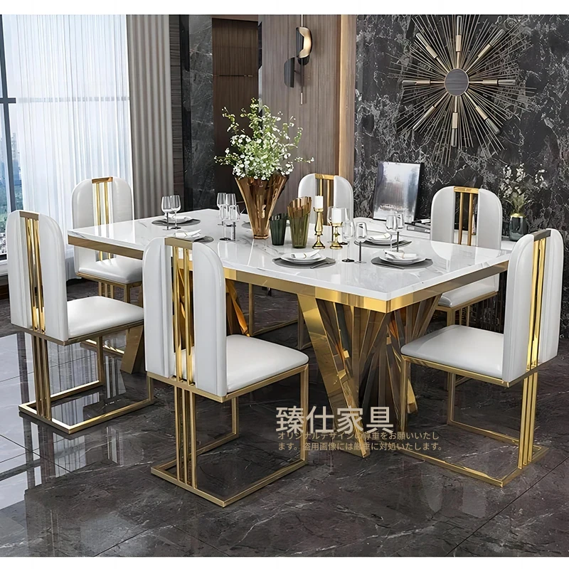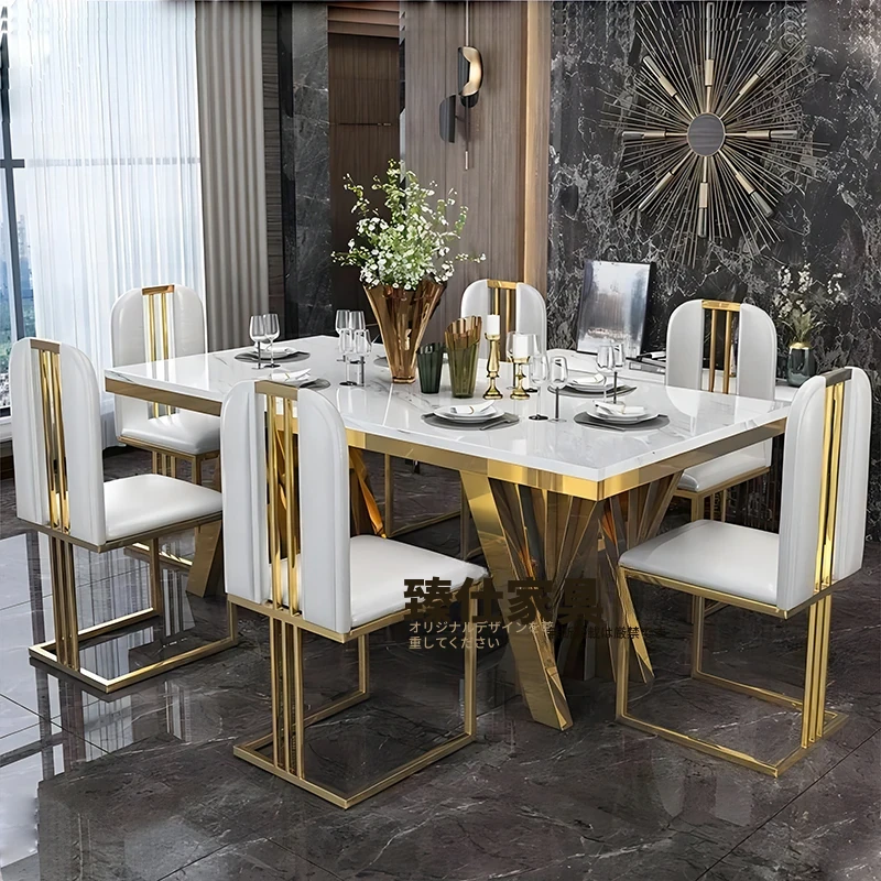 ポストモダンな軽奢華スタイルのステンレス鋼と大理石のダイニングテーブル&チェアセット。広々とした長方形デザインで、大型住宅や別荘に最適な高級セラミック製の食卓。優雅な食事空間を演出します。